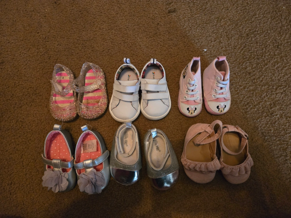 6 sets of baby girl shoes, various styles and colours. Includes jelly shoes, sneakers, Mary Janes, and sandals. Good condition.