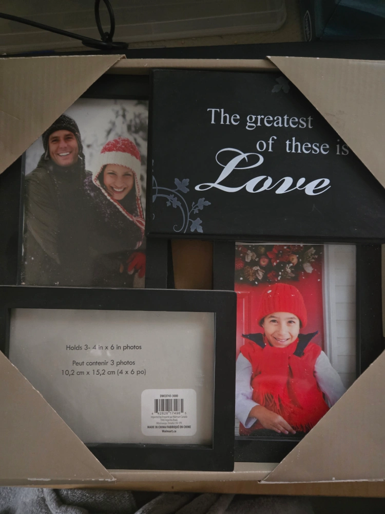 Four-photo collage frame. Holds 3 4x6 photos. Includes a black sign that says "The greatest of these is Love". Good condition.