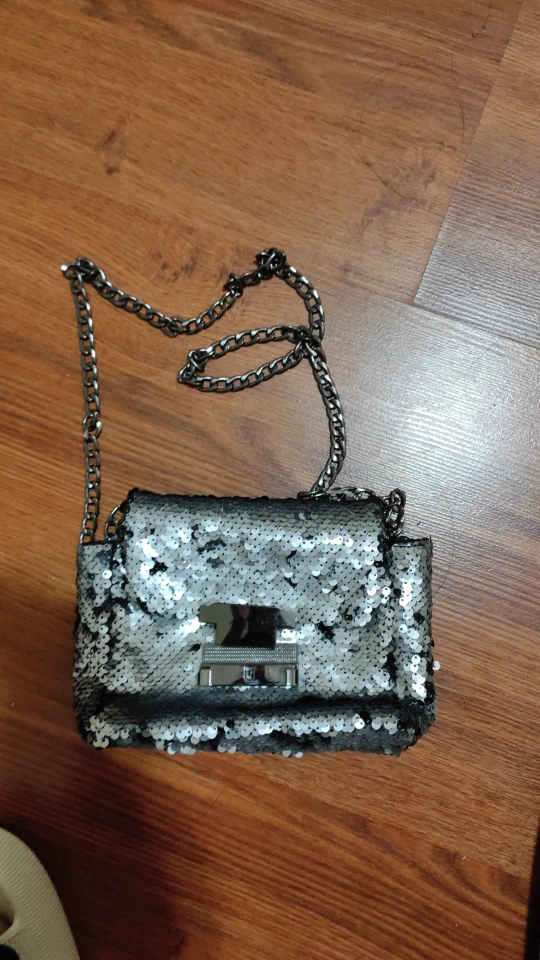 Silver sequin crossbody bag. Features a metal chain strap and flap closure. Small size, perfect for evenings out.