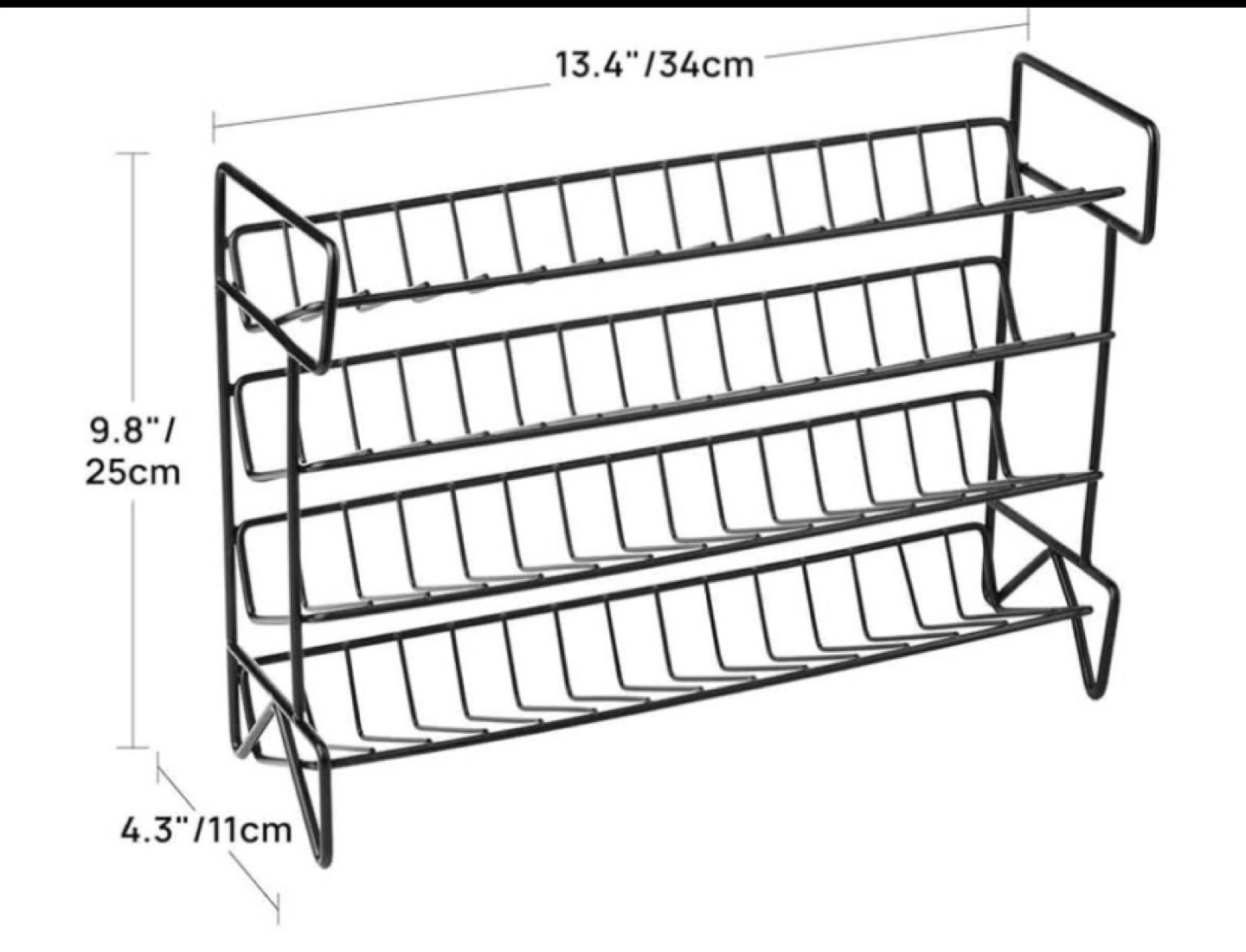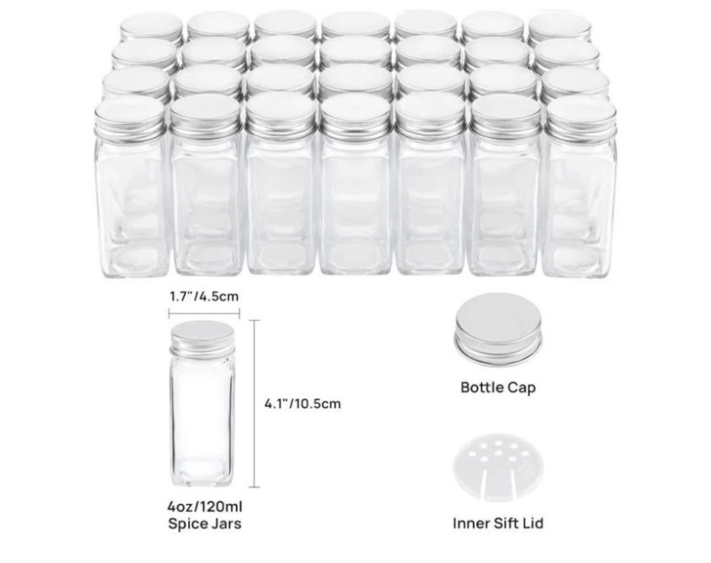Black metal spice rack. Four tiers. Holds thirty 4oz/120ml square glass spice jars with silver lids and sifter inserts. Perfect for organizing your spices.