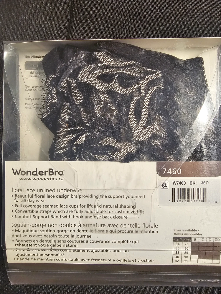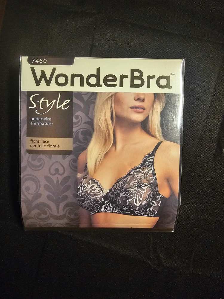 New Wonderbra Style underwire bra. Floral lace design. Full coverage. Adjustable straps and hook-and-eye closure. Comfortable band. Size 36D.