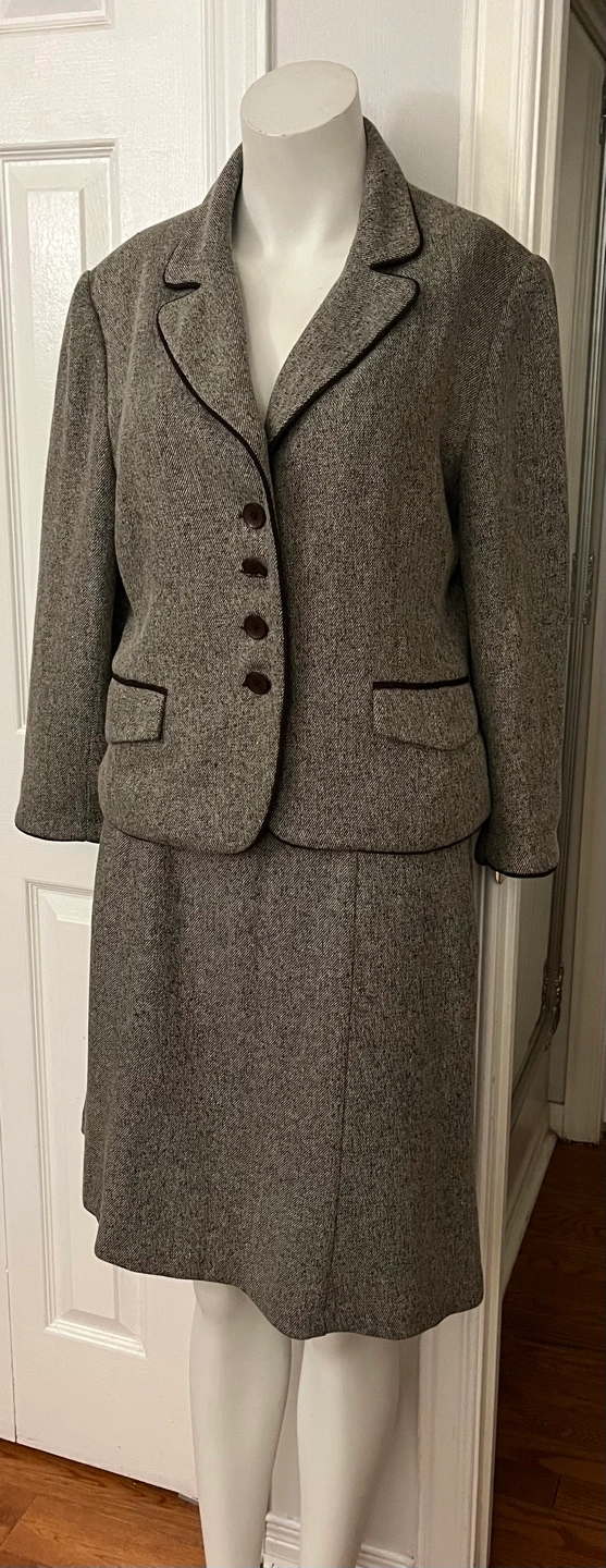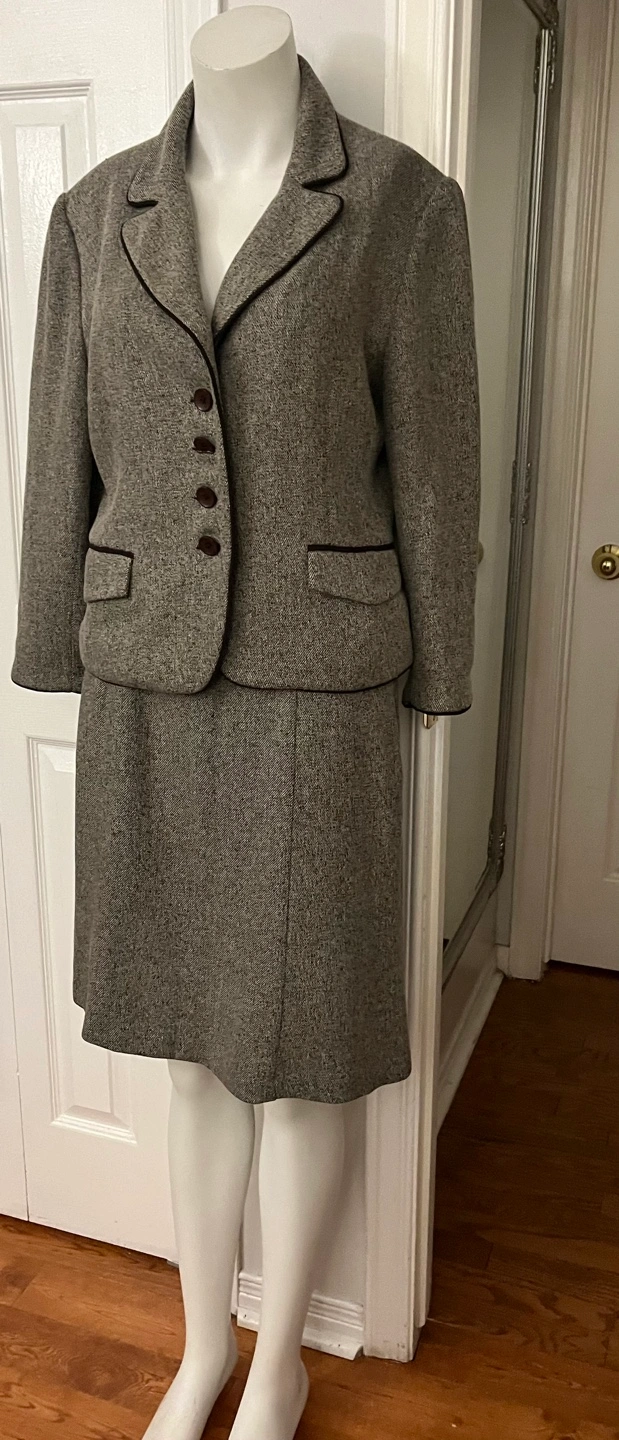 Grey tweed suit. Jacket and skirt. Brown button accents. Size 10.