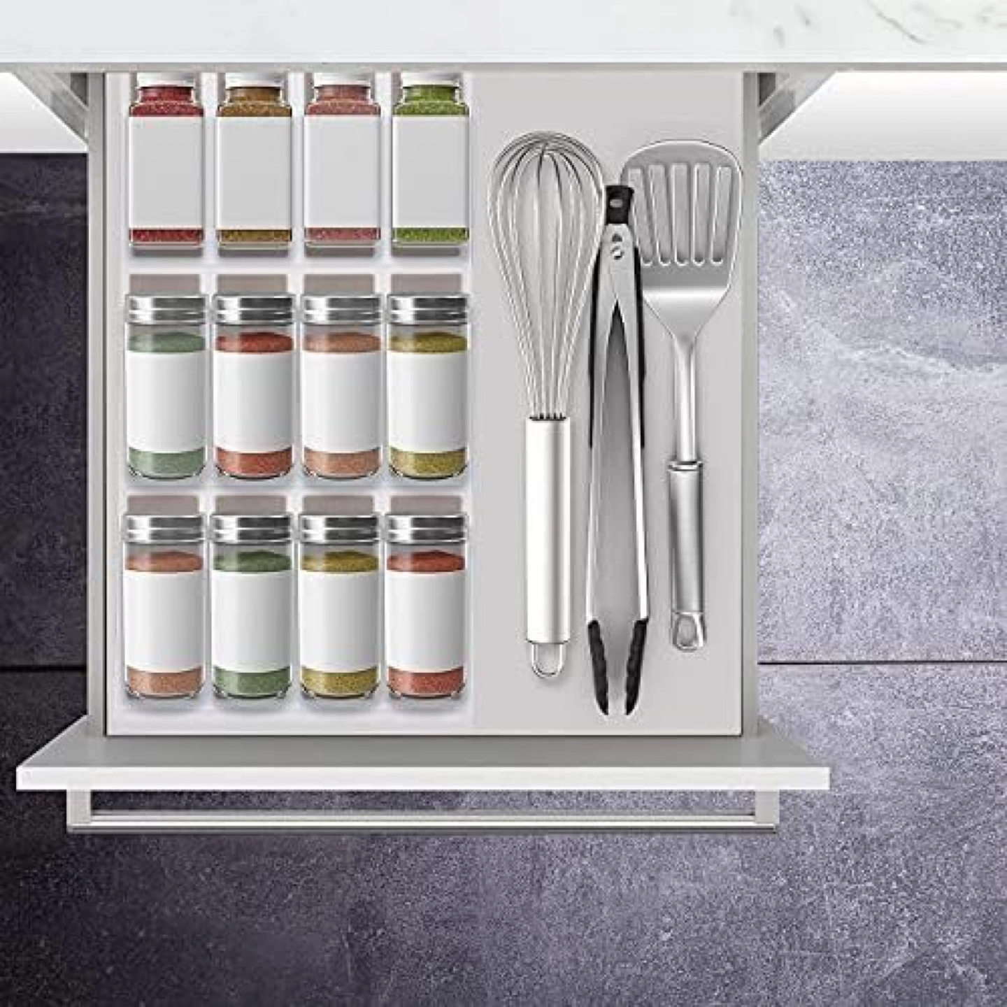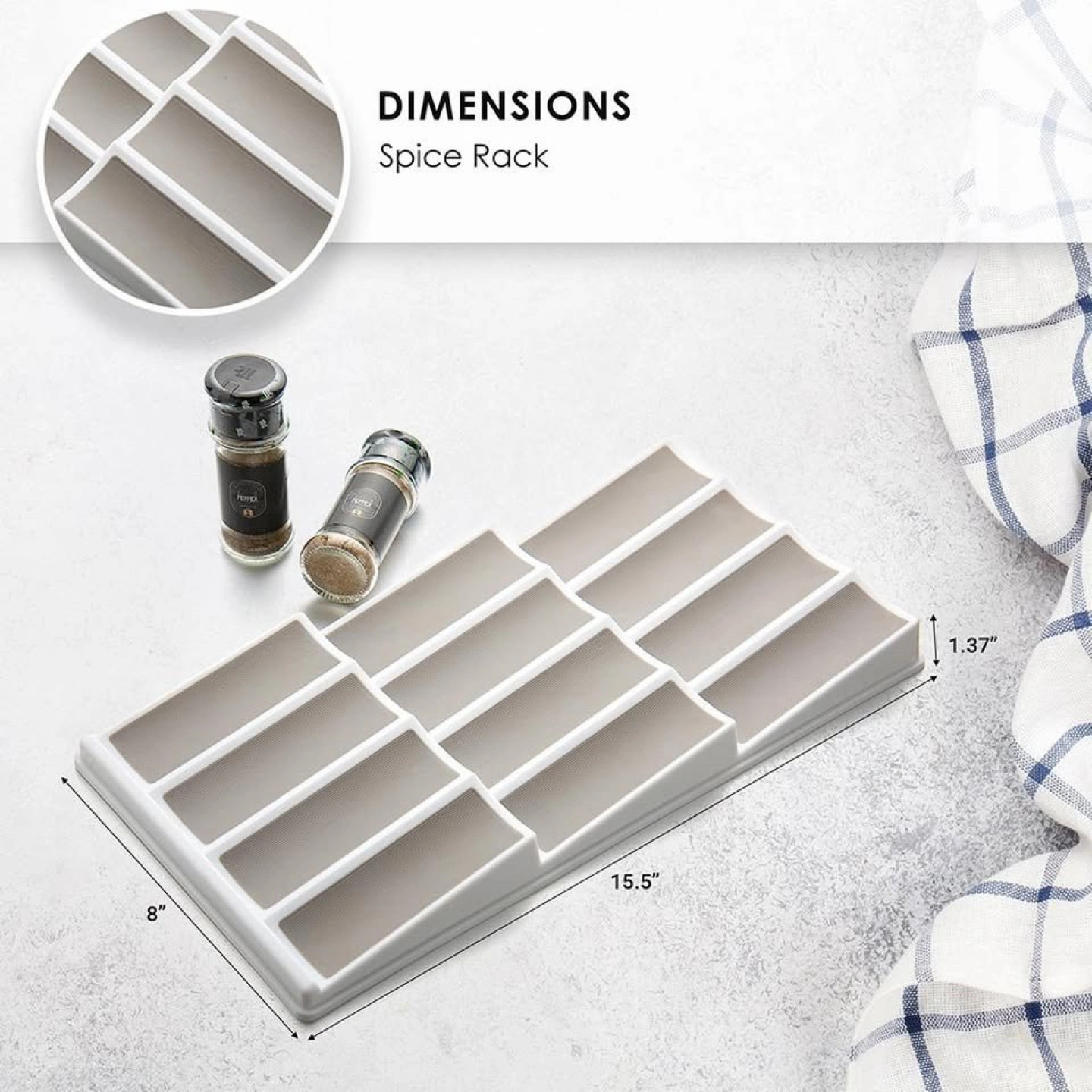 Organize your spices with this grey spice rack. Fits neatly in a drawer. Holds twelve small spice jars.