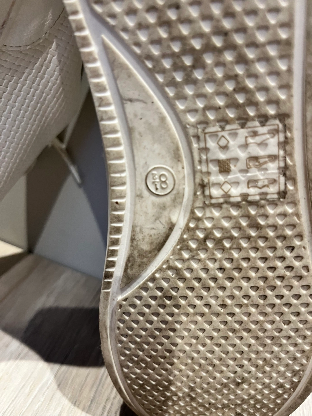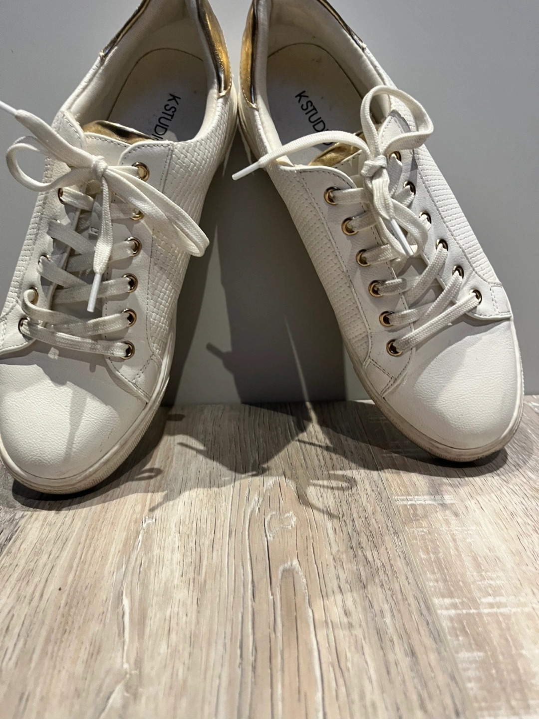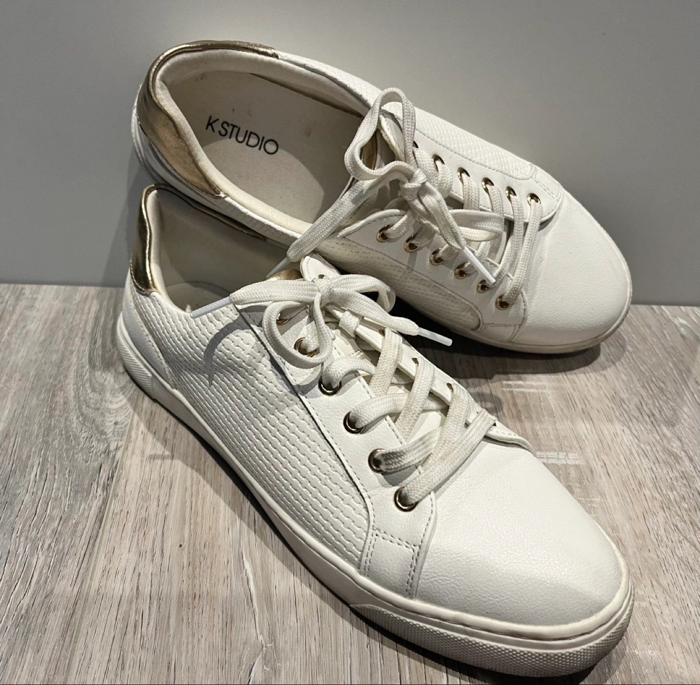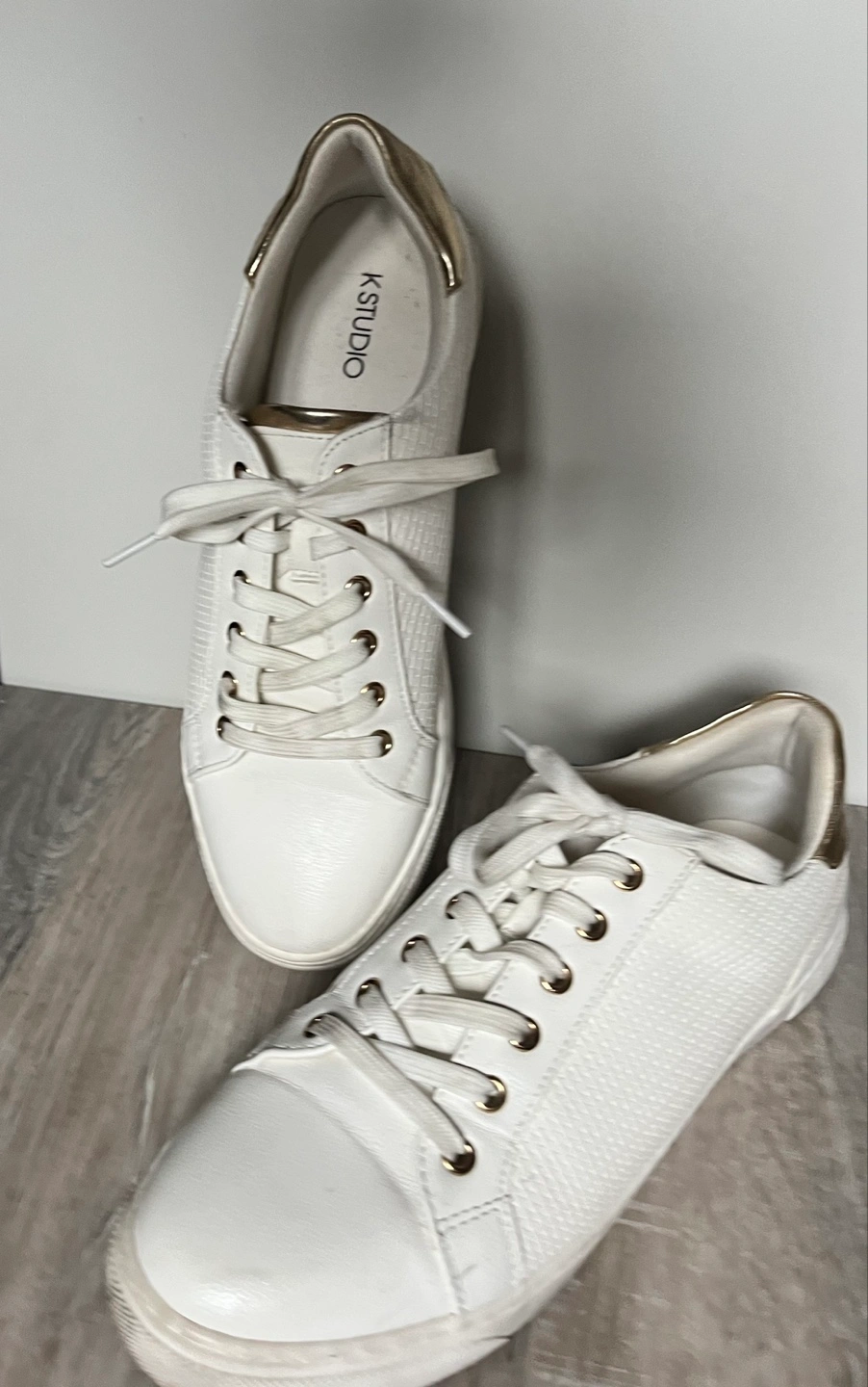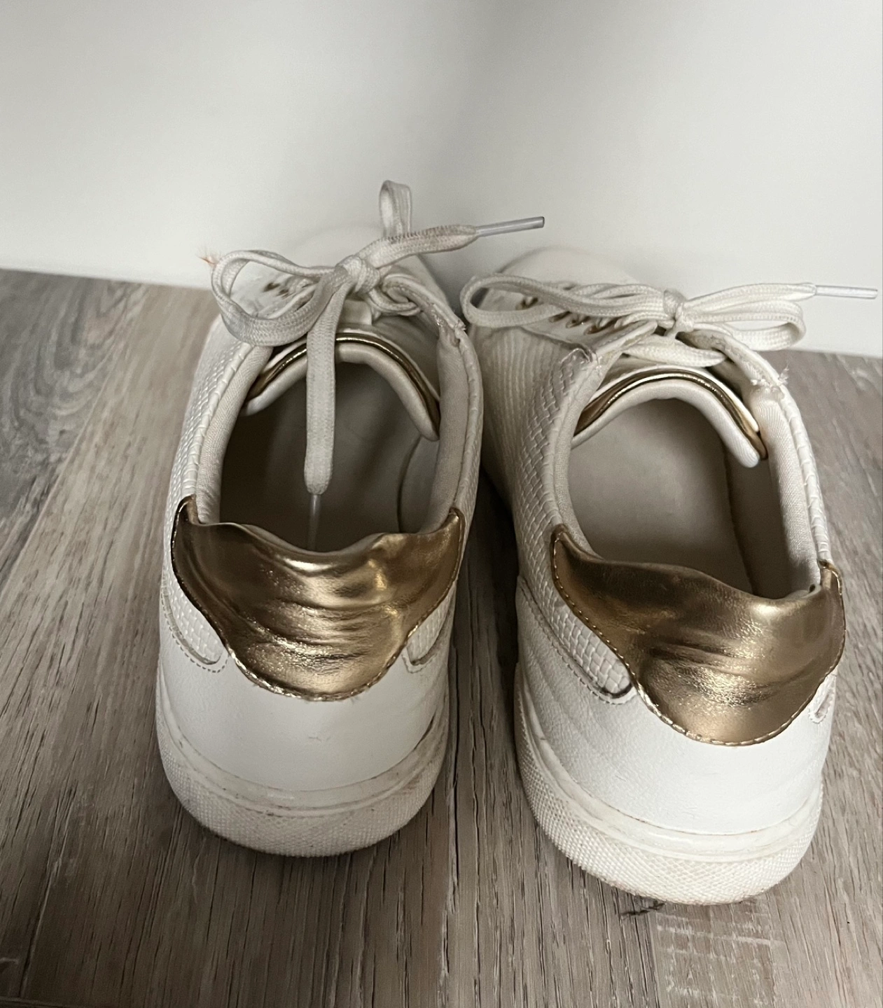 Women's white sneakers with gold accents. Lace-up closure. Textured upper. Slightly soiled soles.
