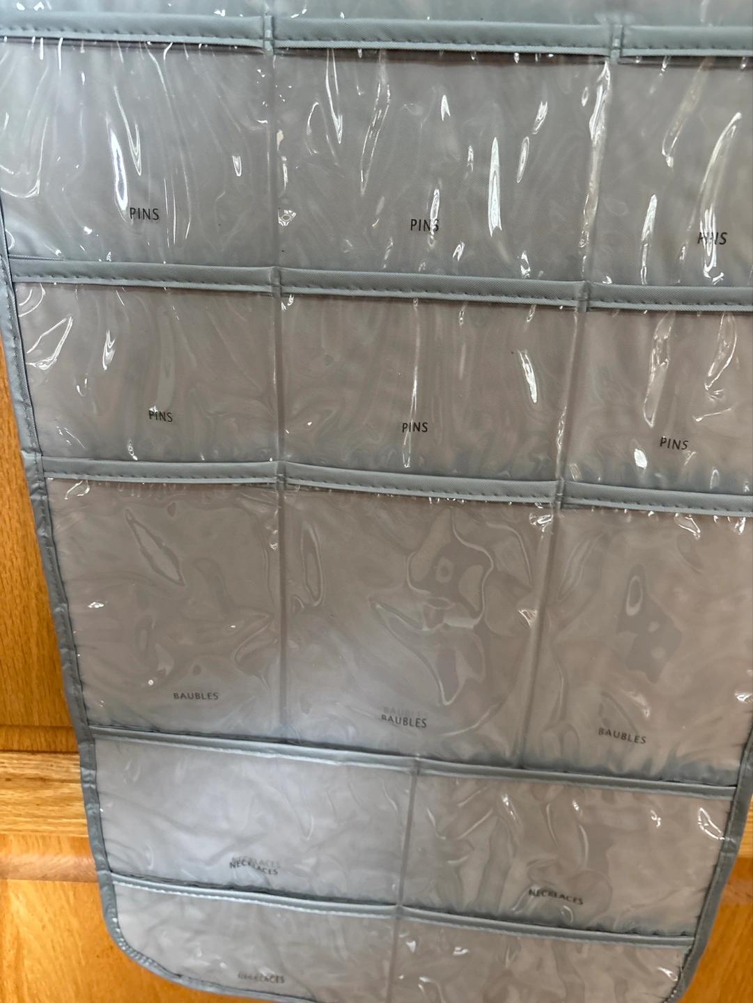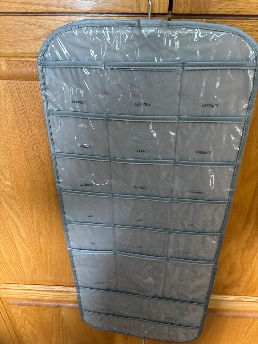 Grey hanging organizer. Multiple compartments for earrings, pins, and necklaces. Clear plastic pockets. Great for closet storage.