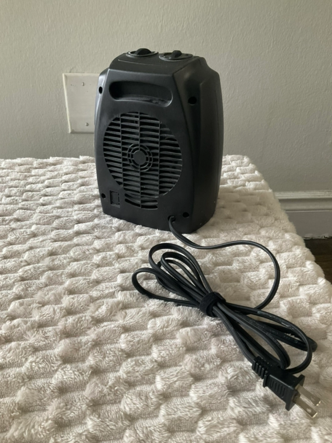 Small black ceramic heater. Features two knobs for temperature and fan control. Includes power cord. Portable and lightweight.