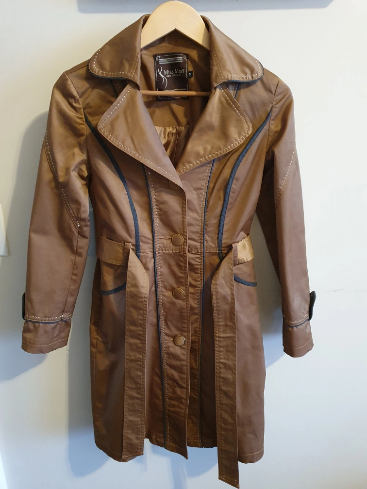 Gorgeous brown trench coat. Belted waist. Long sleeves. Button closure. features grey detailing. Excellent condition.
