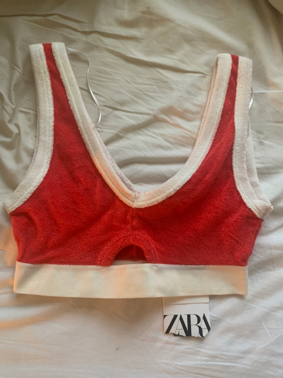 Red terrycloth crop top. Features white trim. Small keyhole cutout at centre. Brand new with tags. Size small. Elastic waist is not a crisp white like the Terrycloth material that is white. Just in time for some spring workouts!