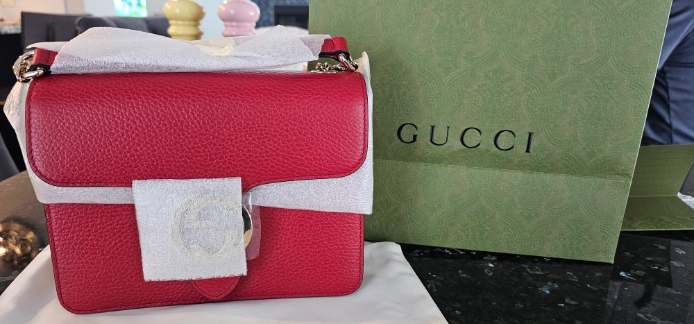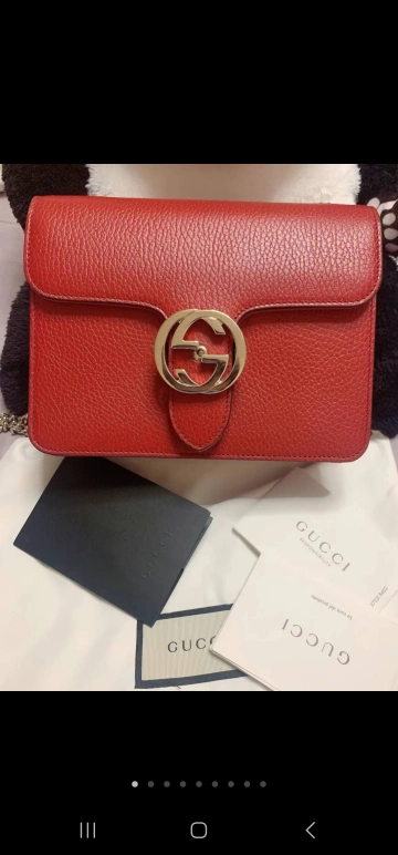 Gorgeous red leather Gucci bag. Features a gold chain strap and GG logo. Comes with dust bag and care materials. Excellent condition.