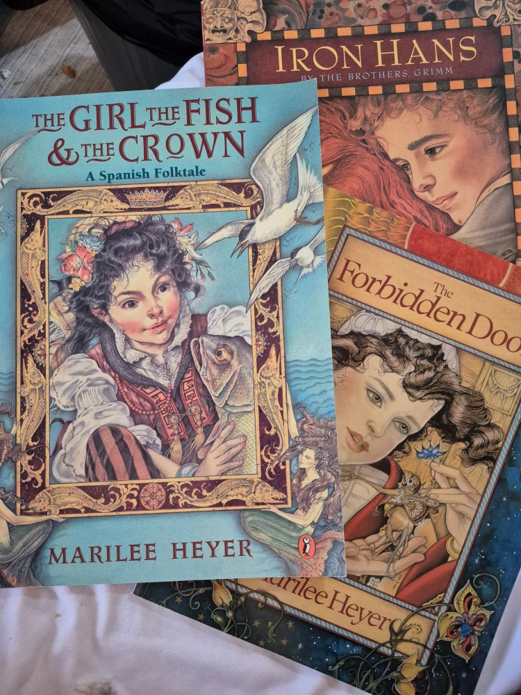Collection of three beautifully illustrated children's books. Includes *The Girl, the Fish & the Crown*, *Iron Hans*, and *The Forbidden Door*. Spanish folktale and Grimm's fairy tales. Excellent These have never been used with children. They are from my personal book collection - children's books with stunning art. They would be suitable for gift giving.