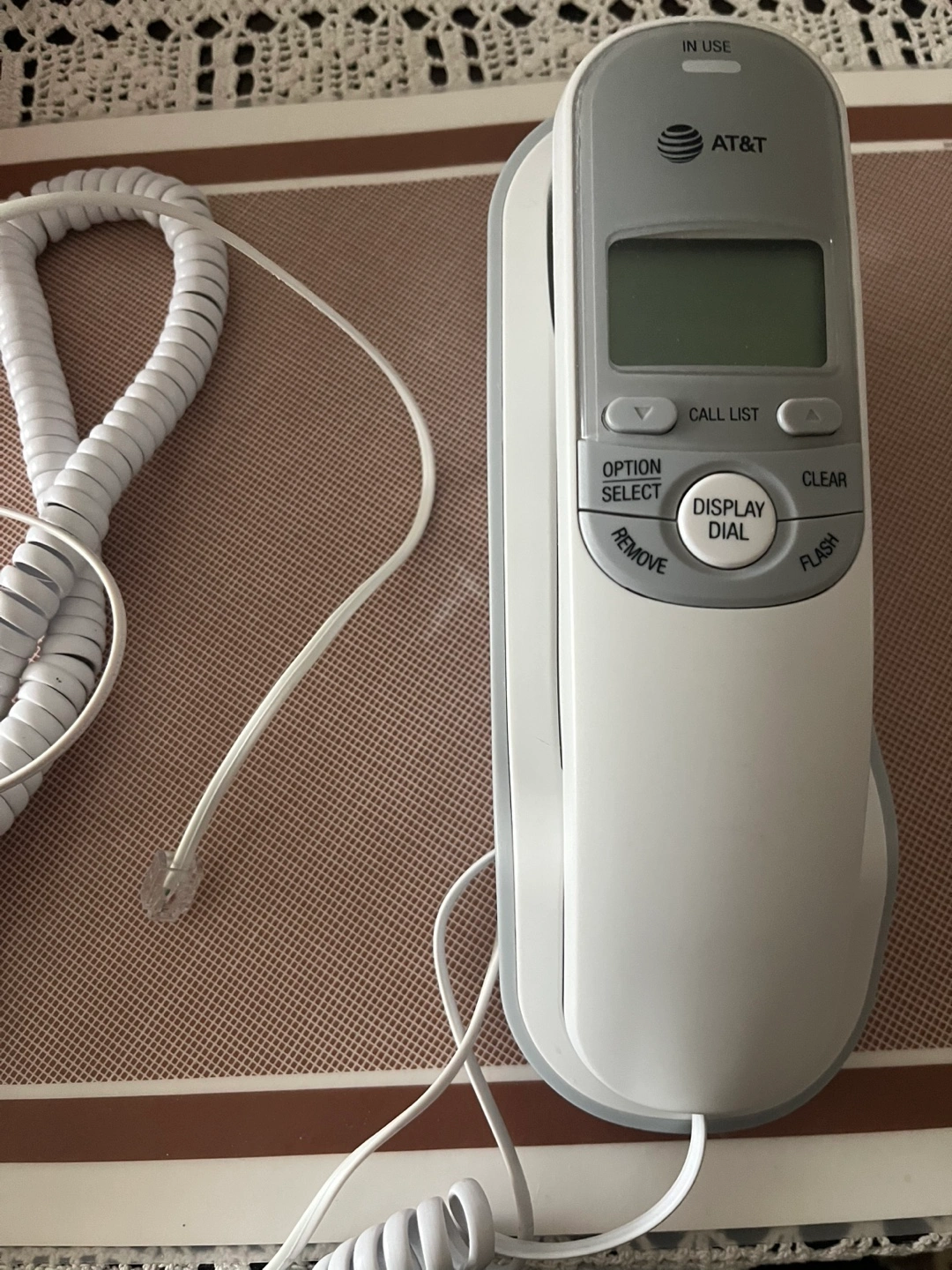 NEW Corded phone, dual LCD display, white and grey. Great for seniors! Includes coiled cord and 1.5 metre extension cord. Call list function & Memory buttons. Wall attachment included Similar item selling online for over $60 - see attached phone for price comparison *Extra 3 metre extension cord available for $2 extra - see photo - black cord No smoking and no pet household