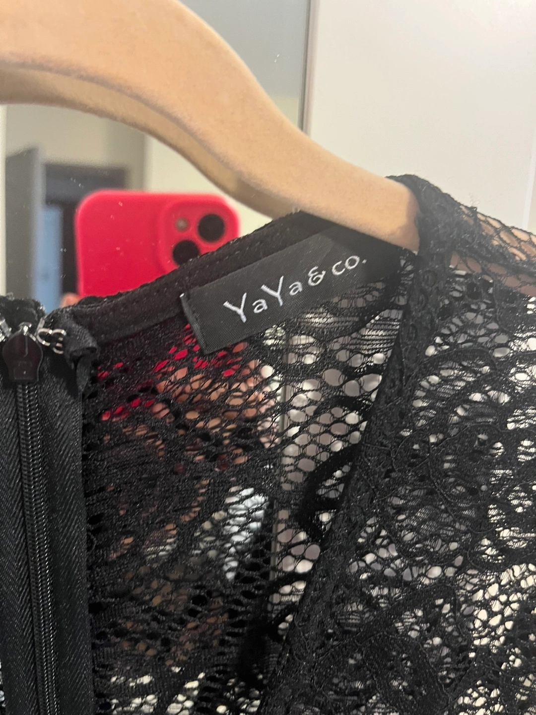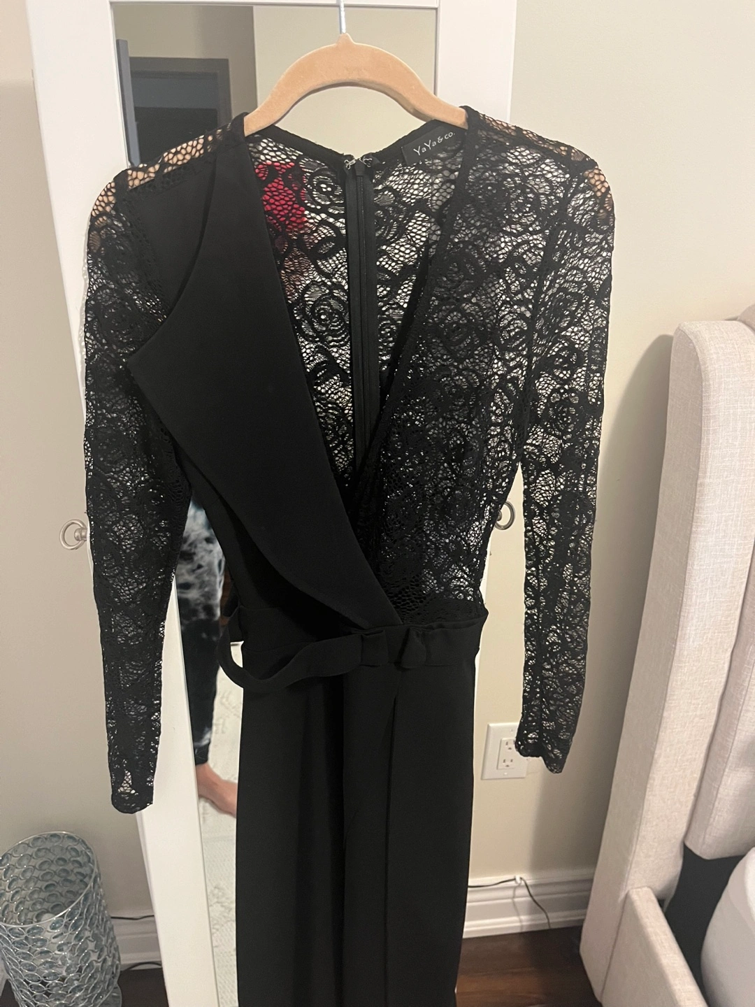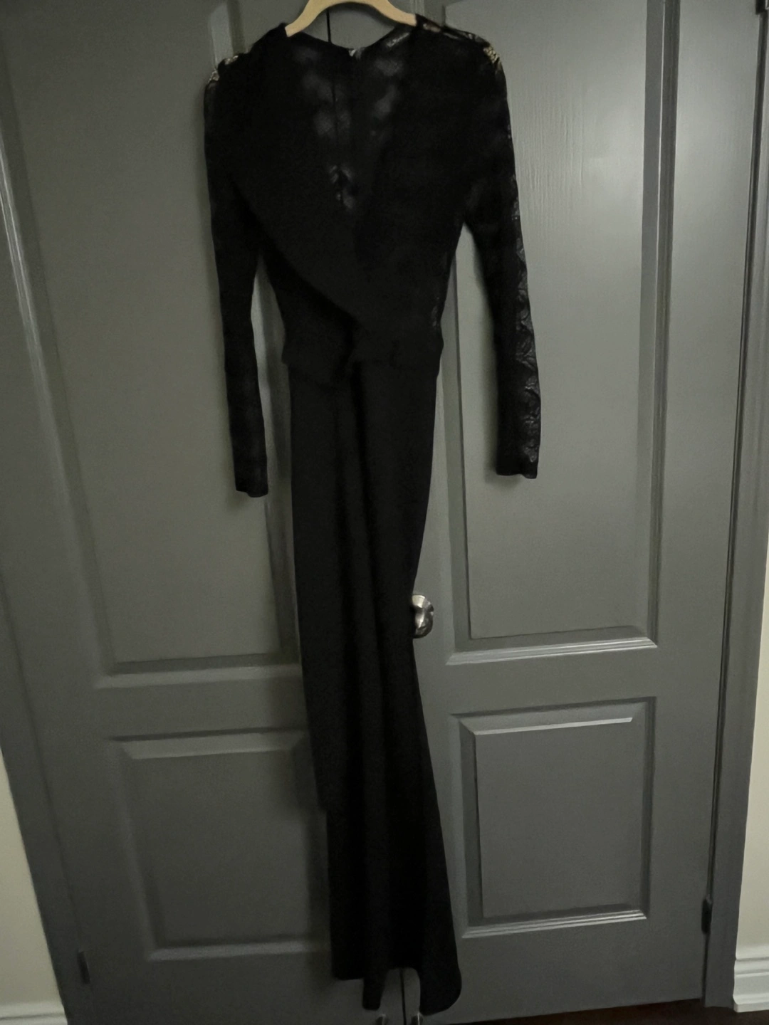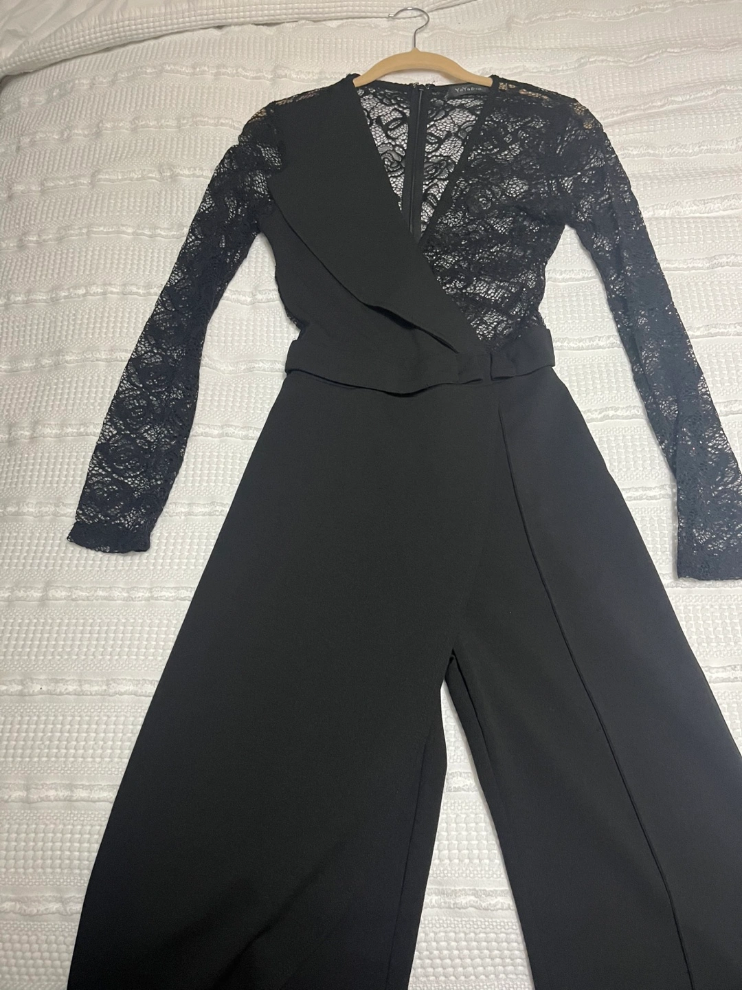 Elegant black jumpsuit. Features a wide leg silhouette and long sleeves. Lace overlay detail at the neckline and upper body. Perfect for a special occasion. Worn ones