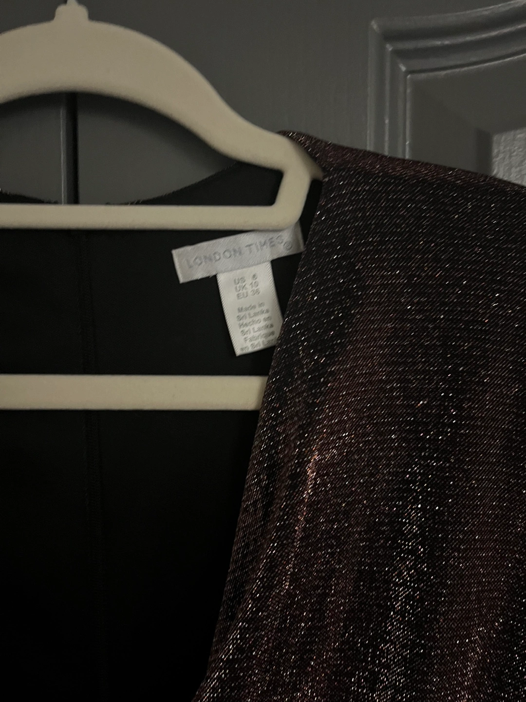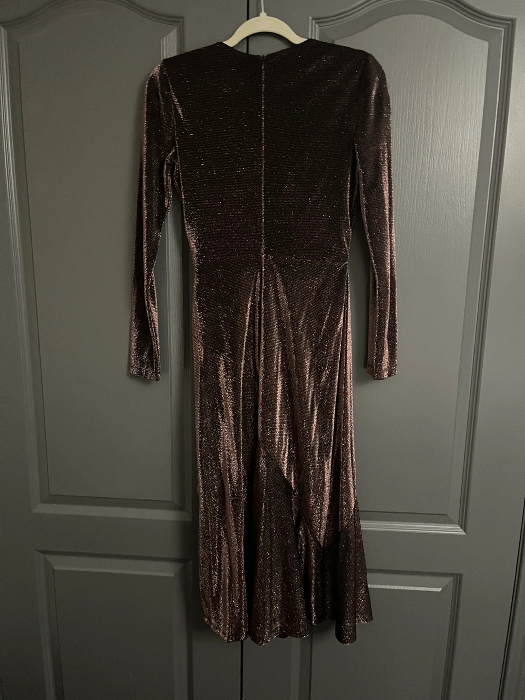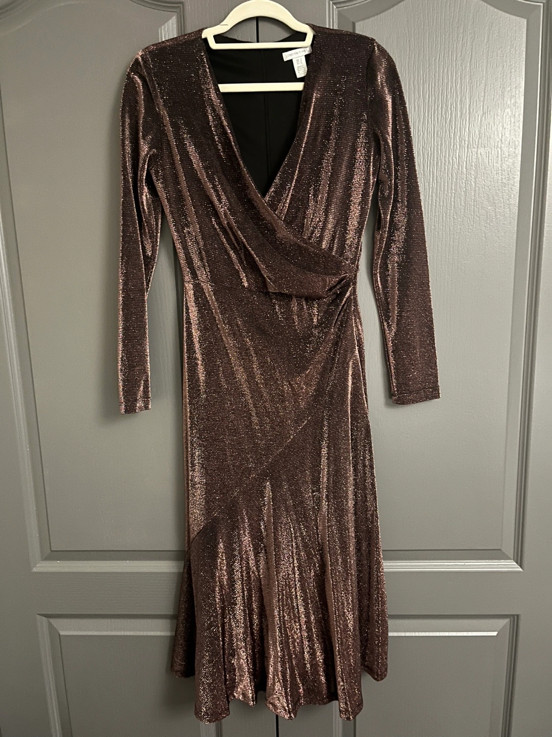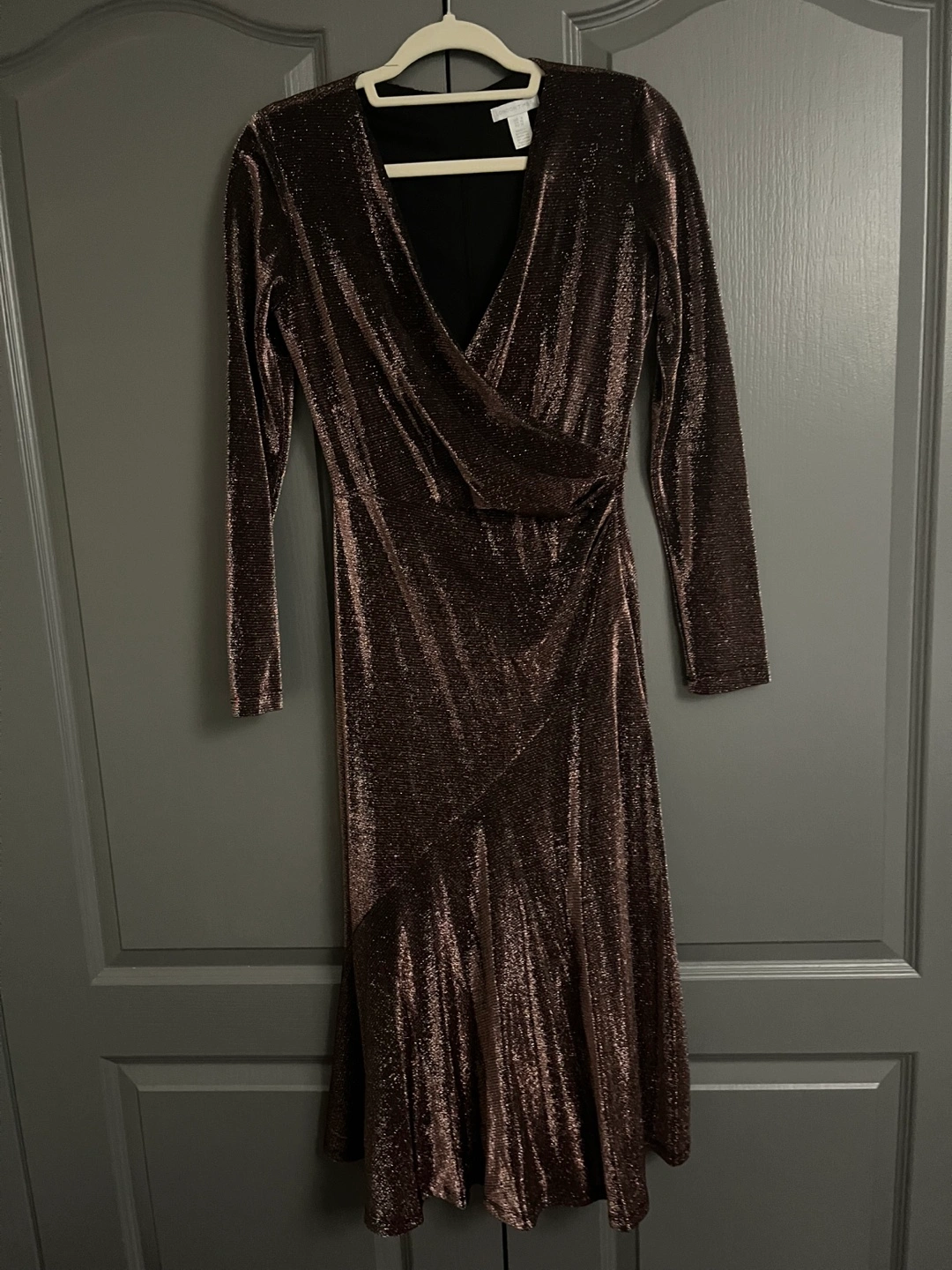 Stunning bronze metallic midi dress. Features a wrap silhouette, long sleeves, and a flattering fit. Perfect for a special occasion.