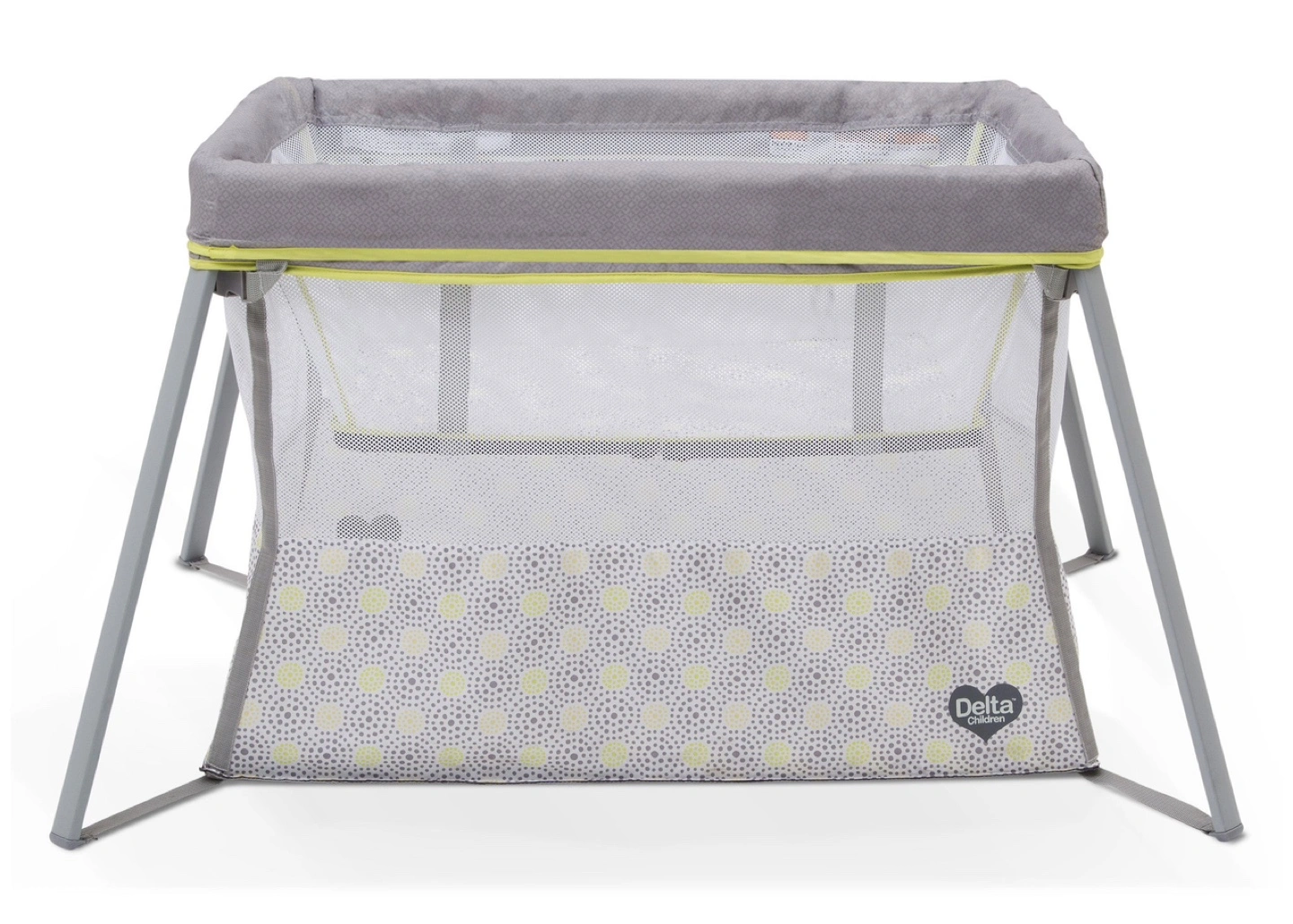 Portable playard. Grey and yellow design. Lightweight and easy to fold. Mesh sides for breathability. Suitable for babies and toddlers. Overstuffed Mattress Pad Bassinet Compartment for Baby up to 15 pounds Convenient Slim Fold and Carry Bag Make Travel And Storage Easy Washable Fabric Cover Easy NO TOOL Assembly Meets or Exceeds all ASTM and CPSC Standards and JPMA Certifications Assembled Dimensions (in inches): 47 (width) by 24.75 (height) by 35 (depth) Product Weight (in pounds): 10.5 Pick up only Located near Mt. Pleasant and Eglinton Ave East