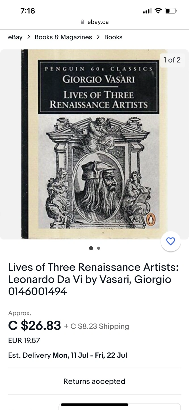 Penguin Classics edition. Giorgio Vasari's *Lives of Three Renaissance Artists*. Includes Leonardo Da Vinci. Used book.