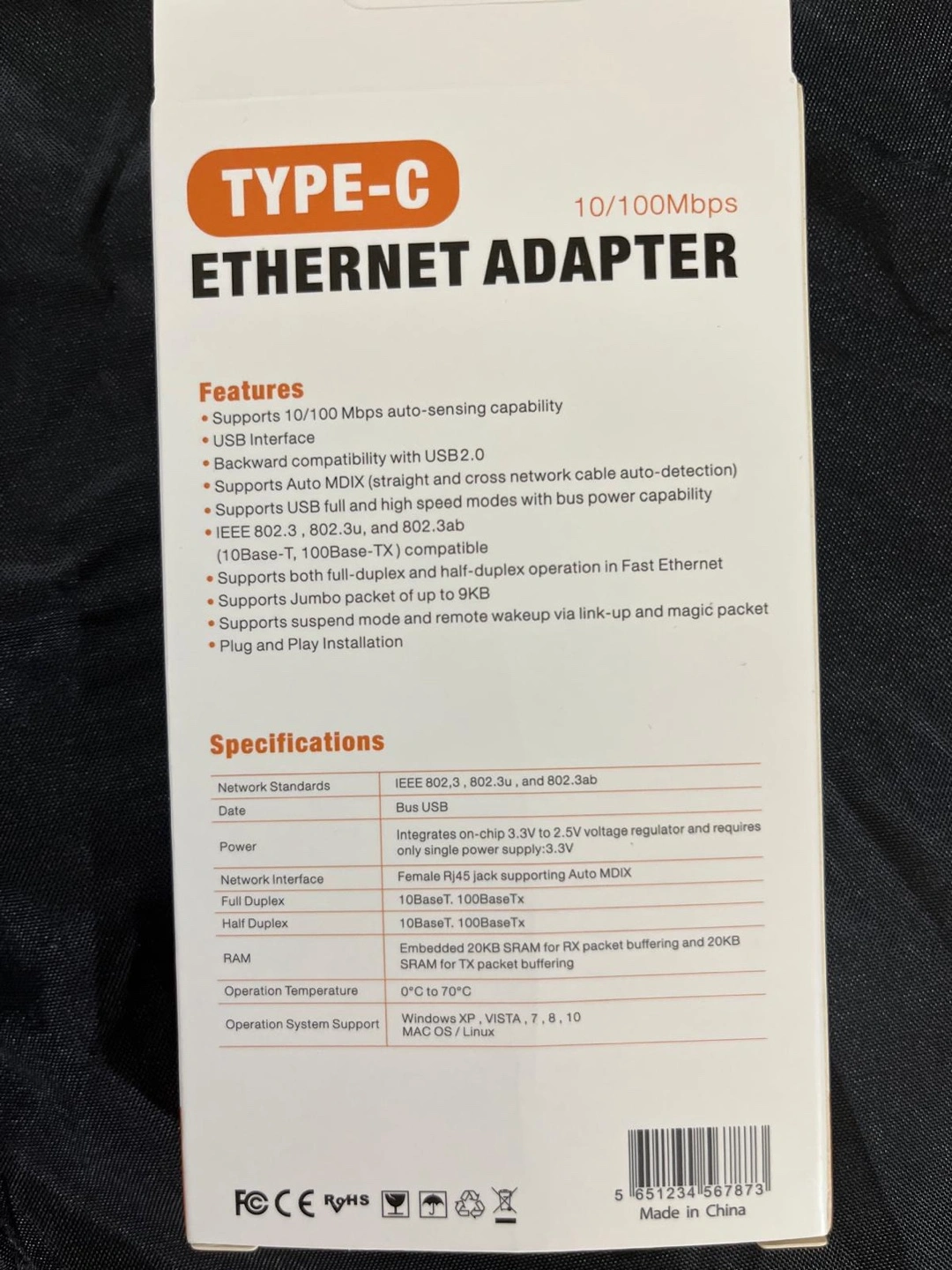 Brand new, never used. USB-C Ethernet adapter. Plug and play. Compatible with Windows and Mac OS. Small and portable. 10/100Mbps auto-sensing.