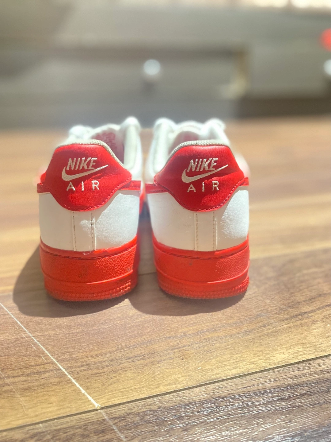 Little used but very good condition Classic Nike Air Force 1 '07 sneakers. White leather upper, red accents. Red sole. Casual style.