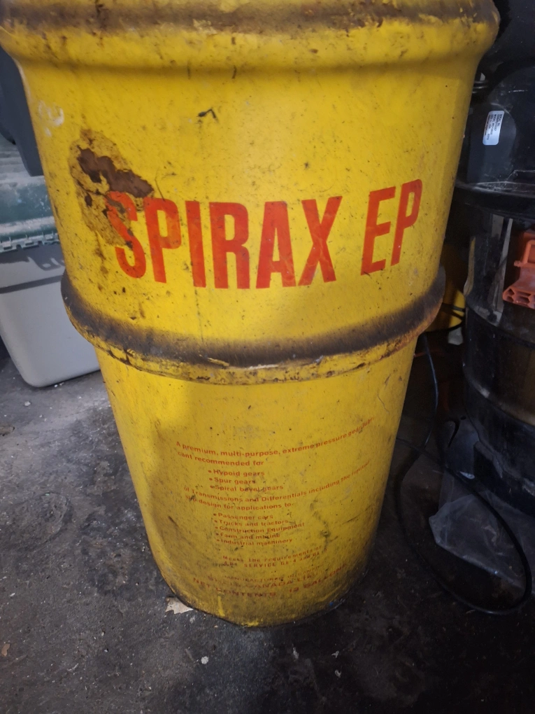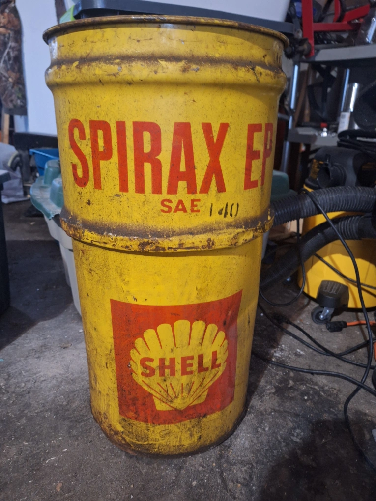 Vintage oil drum. Yellow metal. Shell and Spirax EP branding. Shows wear and tear. Great for industrial decor or repurposing.