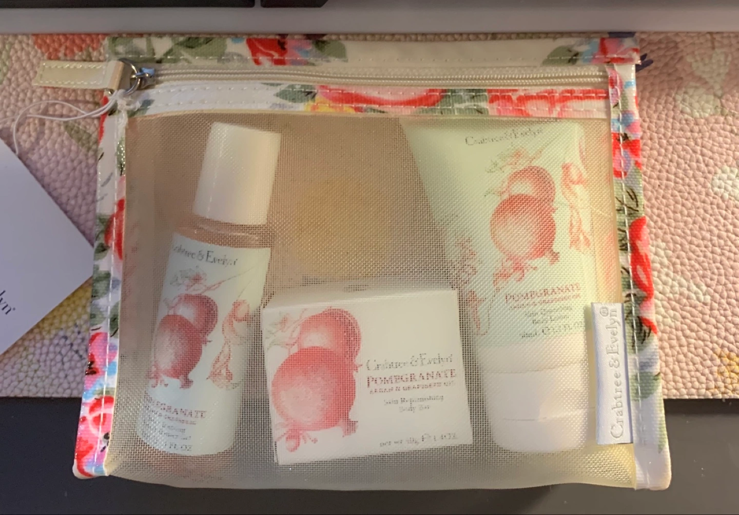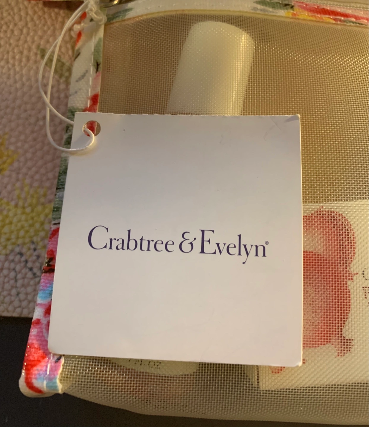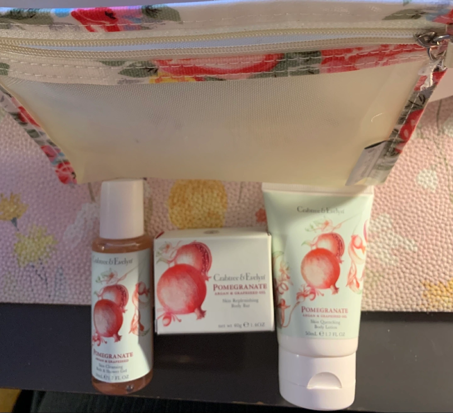 New Crabtree & Evelyn Pomegranate travel set. Includes body wash, body lotion, and soap. Mesh travel bag included. Perfect for travel or a gift. Travel size products.