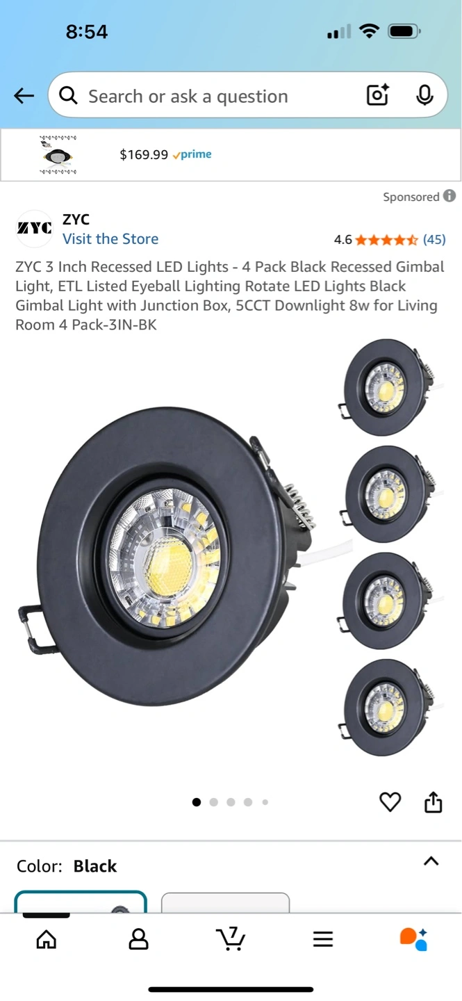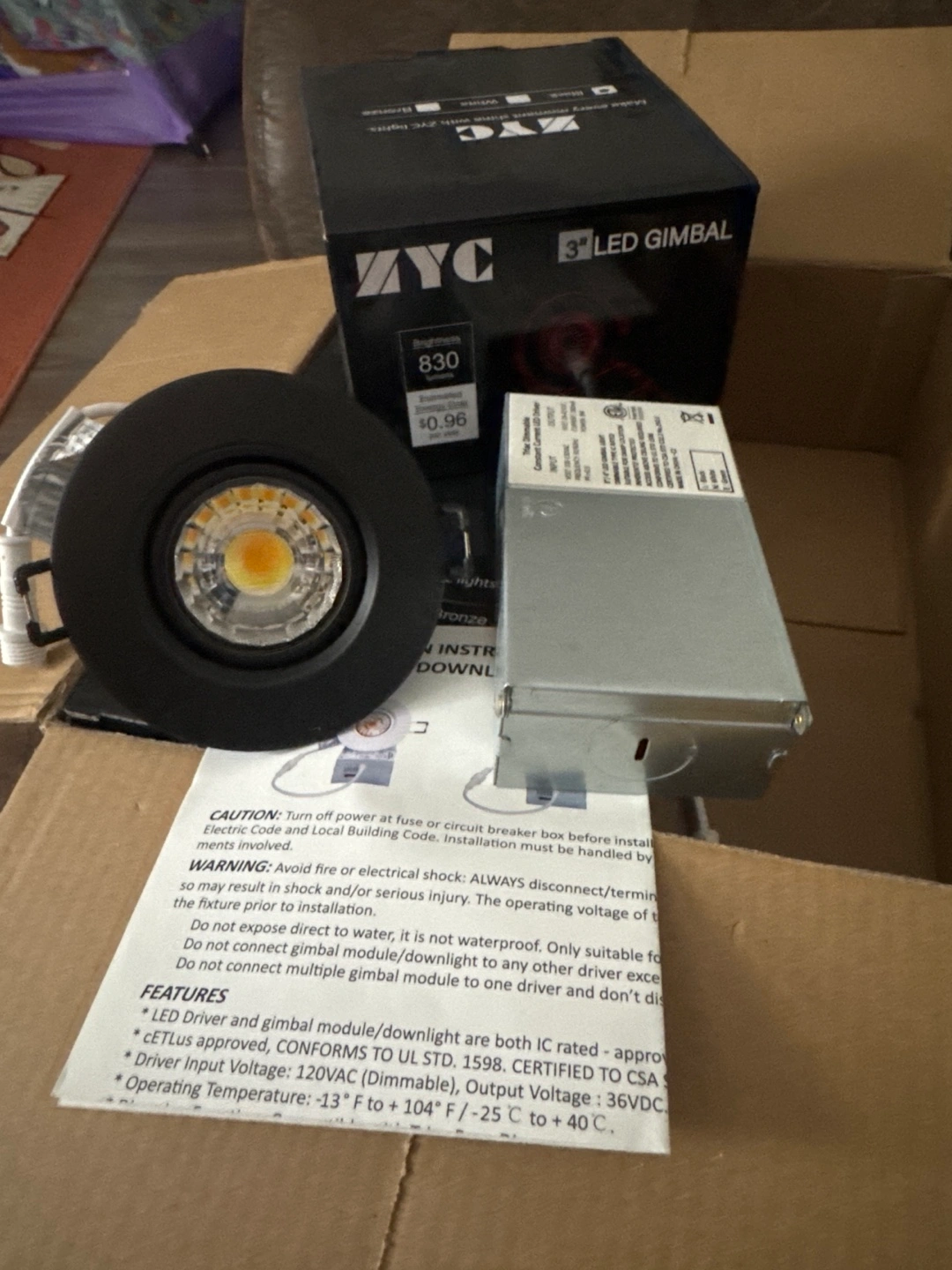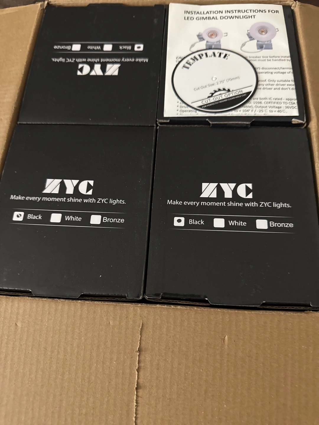 4 pack black recessed gimbal lights. 8w. ETL listed. Includes junction box. Suitable for living rooms. Dimmable. Smoke free pet free Pick up only. Closed to Fairview mall in Kitchener Only serious inquiries Cash only low ballers will be ignored