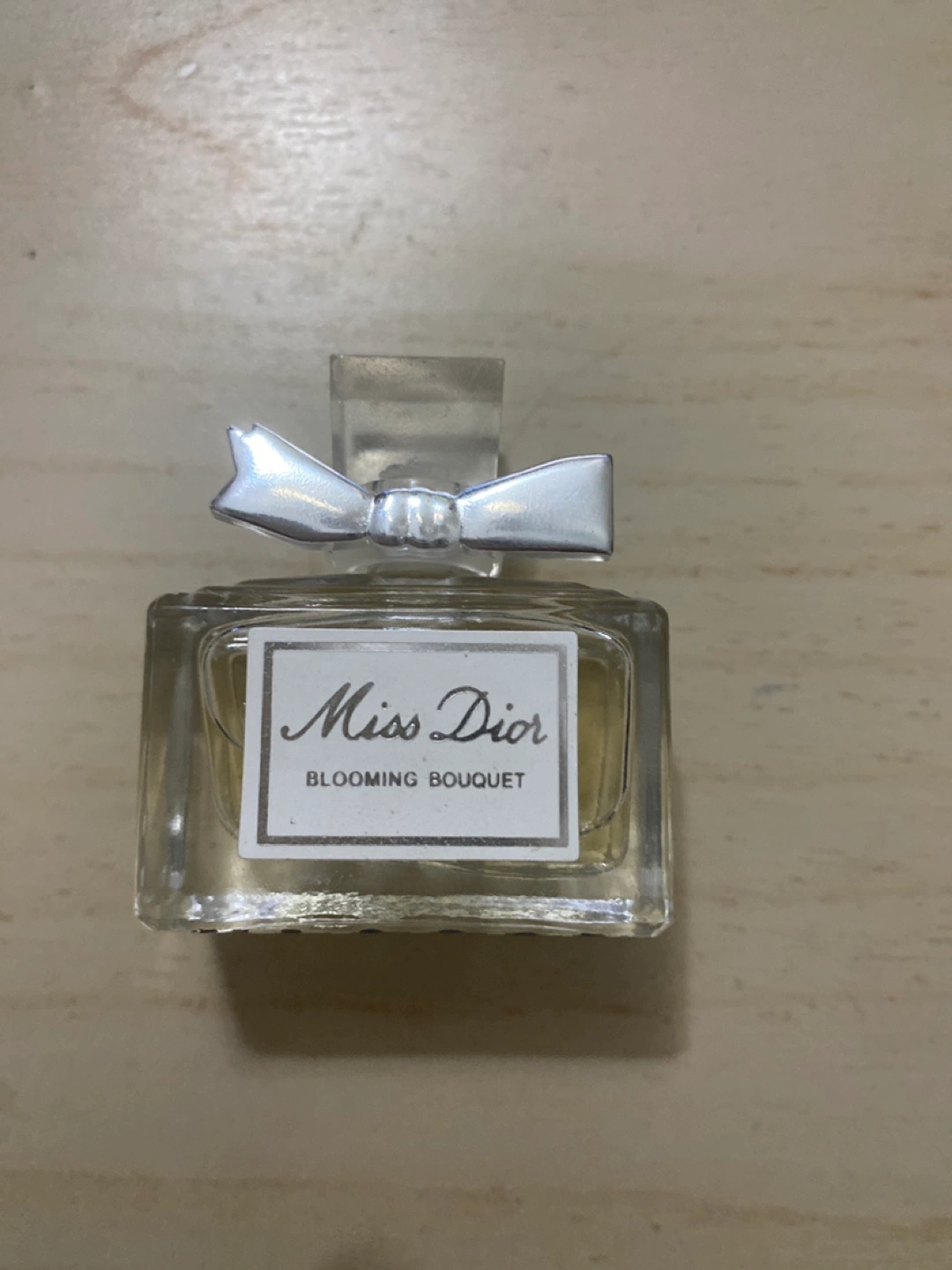 Small bottle of Miss Dior Blooming Bouquet perfume. Silver bow accent. Looks unused. Only opened to smell.