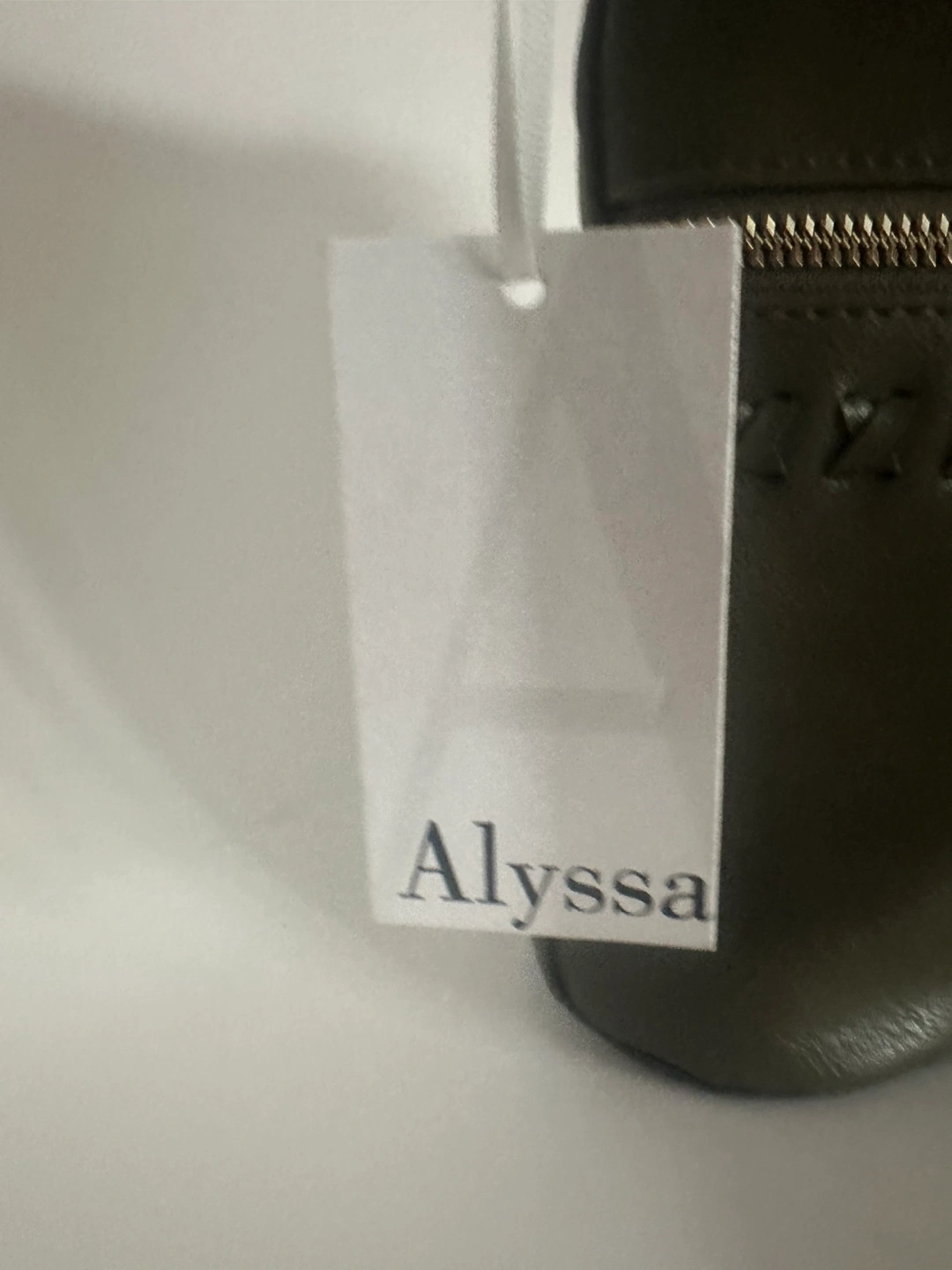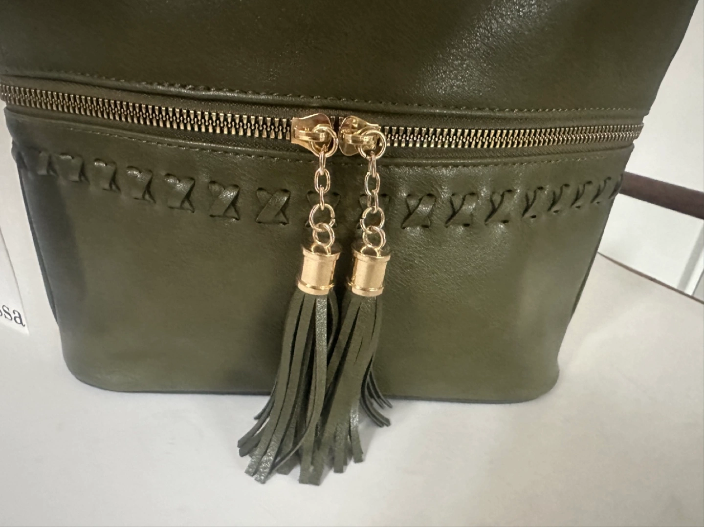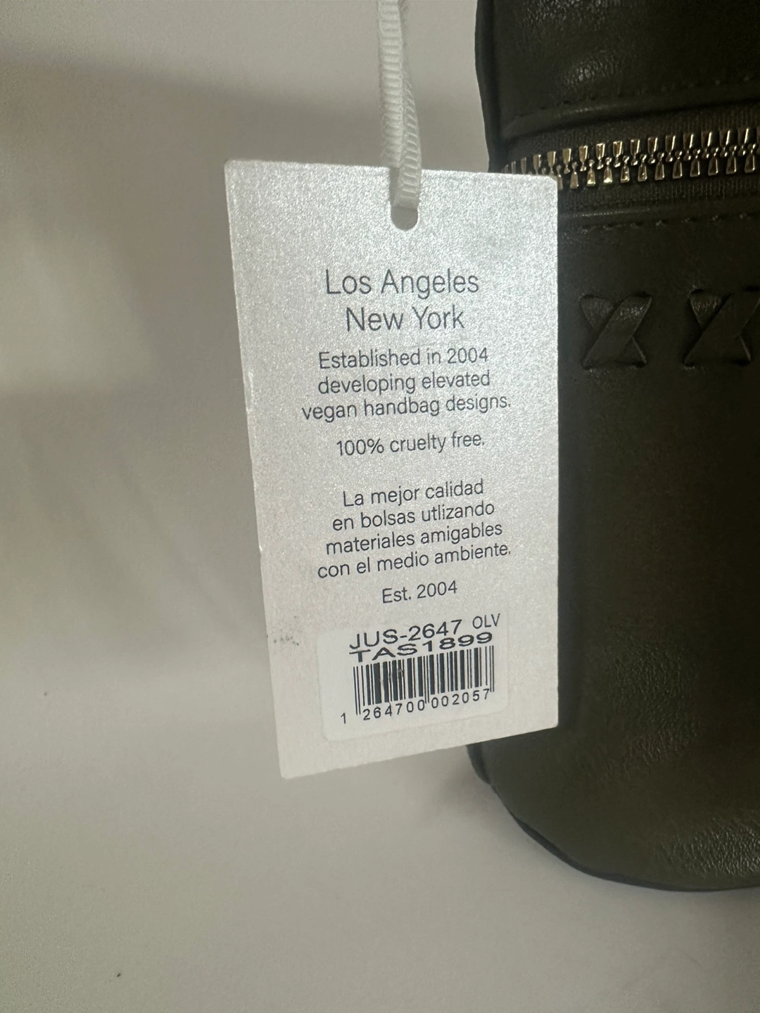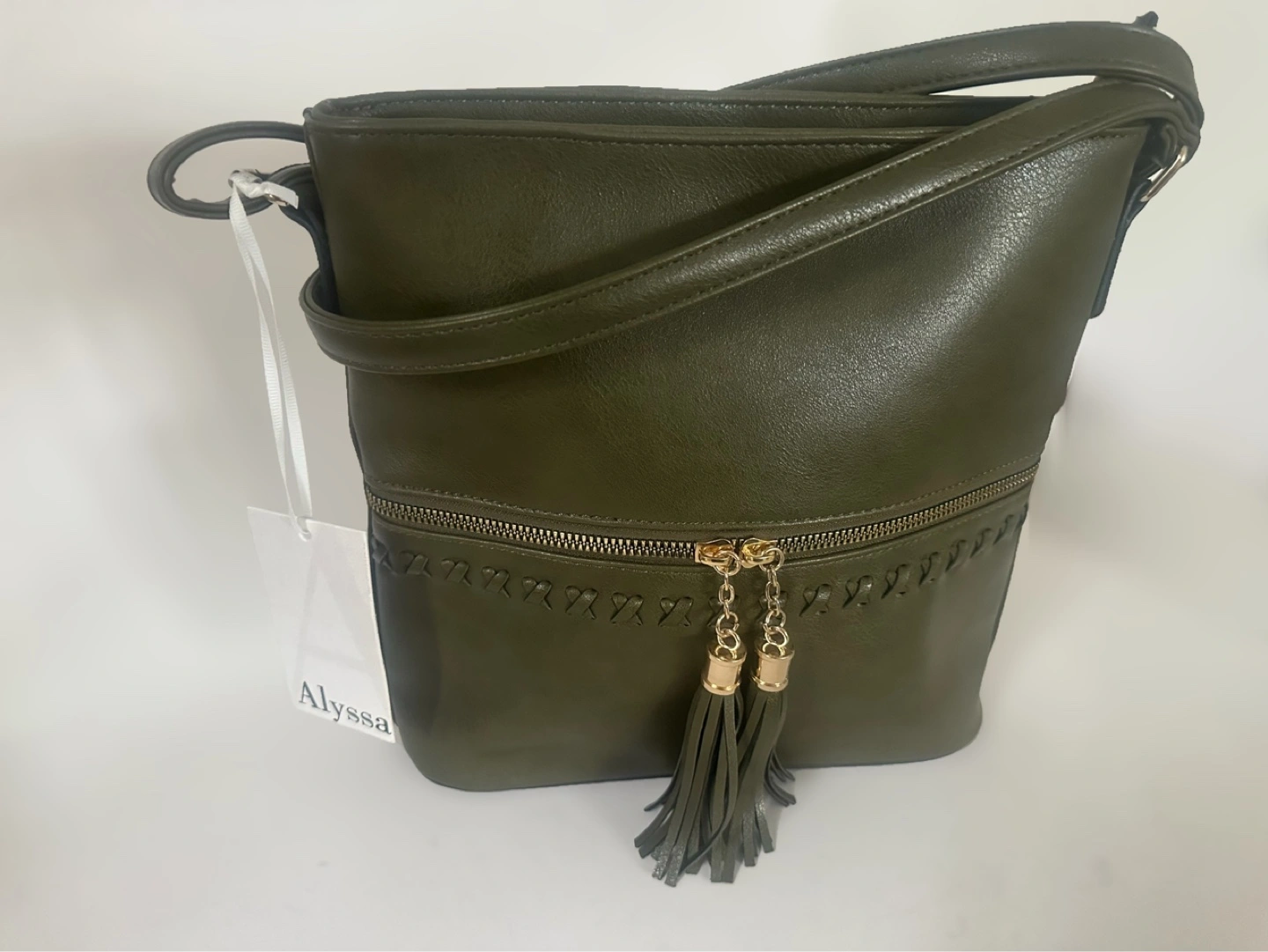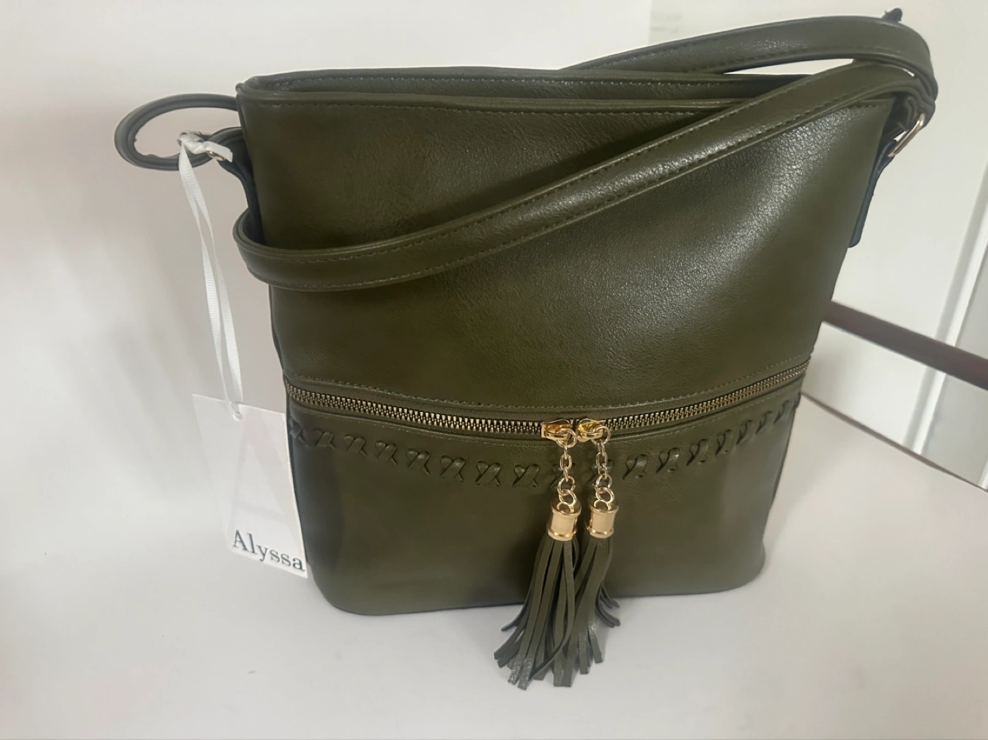 Stylish olive green crossbody bag. Features a zip closure and gold-toned hardware. Vegan leather construction. Perfect for everyday use. From a smoke free pet free home. Pick up in Alta Vista.