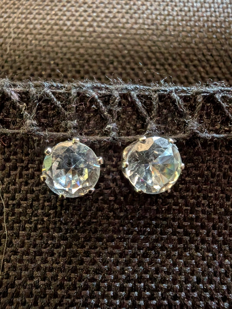 Pair of silver tone stud earrings. Round clear cubic zirconia stones. Post back closure. 925 stamped on the back.