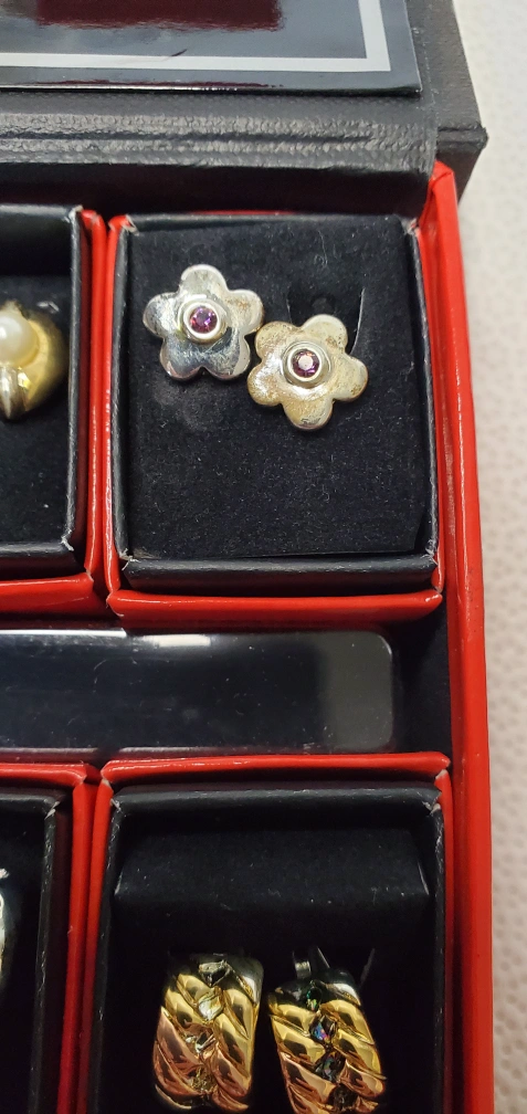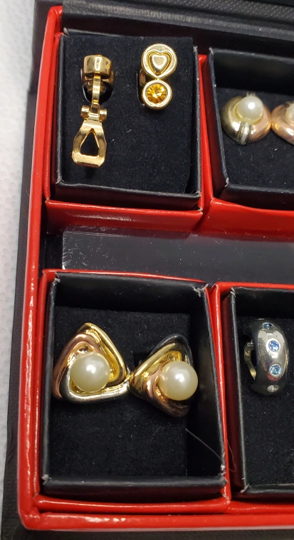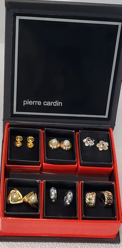 6 pairs of clip-on earrings. Various styles and colours. Comes in original Pierre Cardin box. Vintage collection.