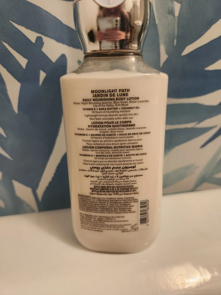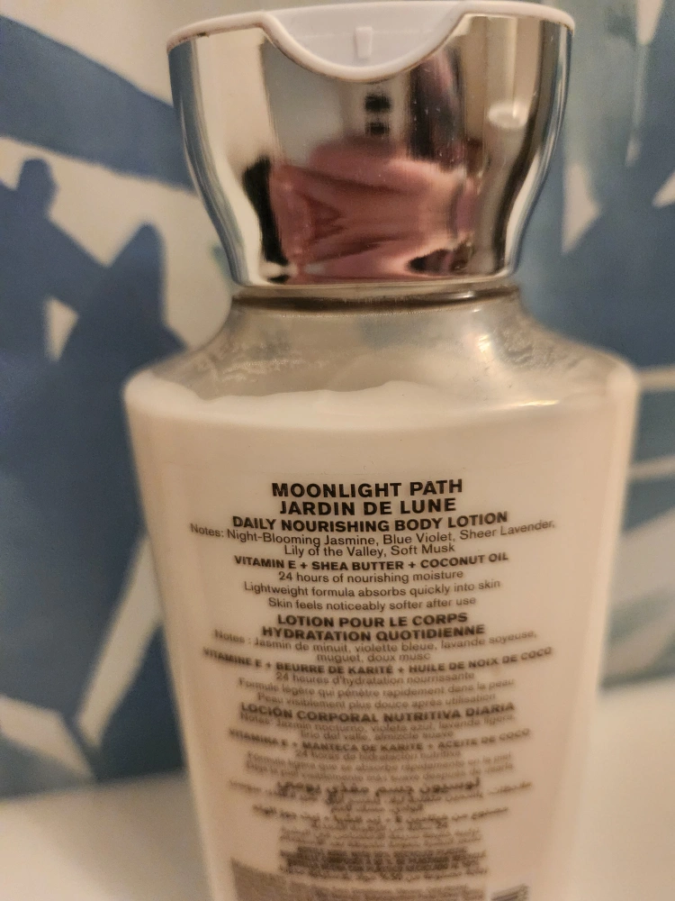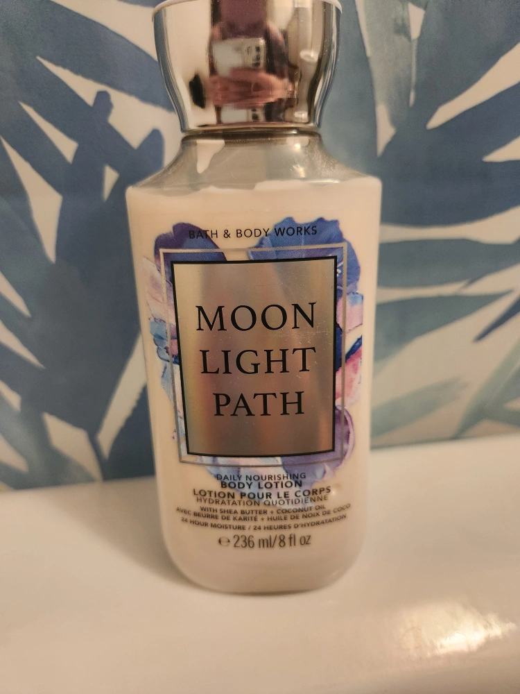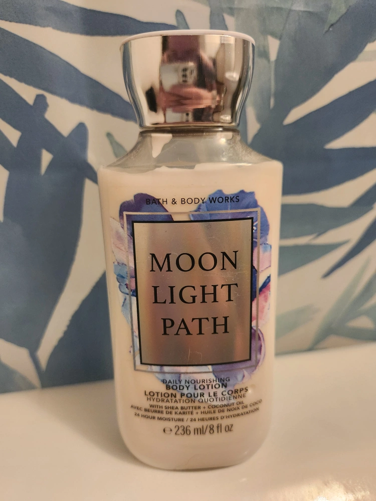 236 ml / 8 fl oz bottle of Moon Light Path body lotion. Daily nourishing lotion with shea butter and coconut oil. 24-hour moisture. Discontinued scent.