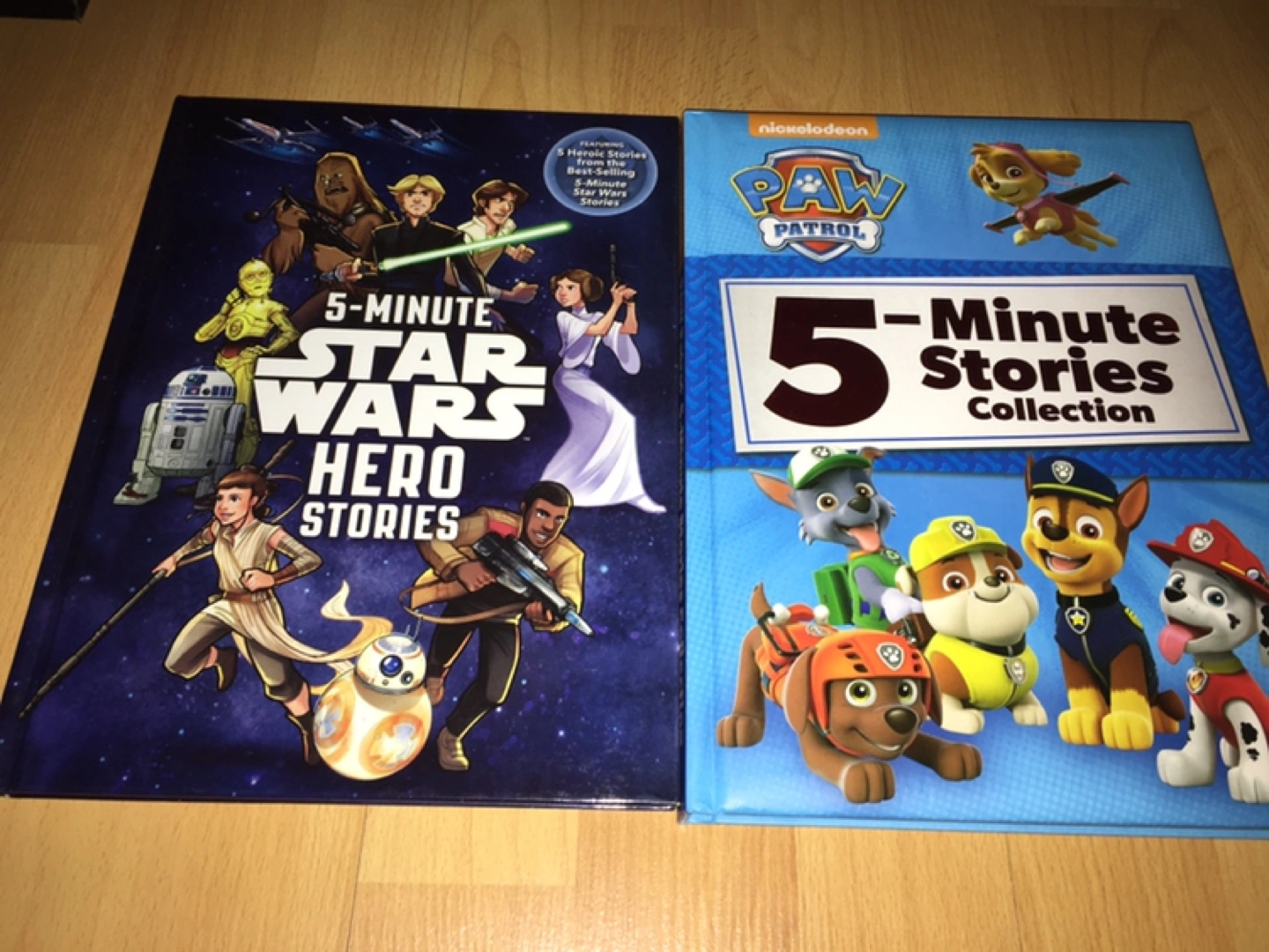 Two children's books. One features Star Wars characters and the other features Paw Patrol characters. Both are 5-minute story collections. Selling each book for $5.