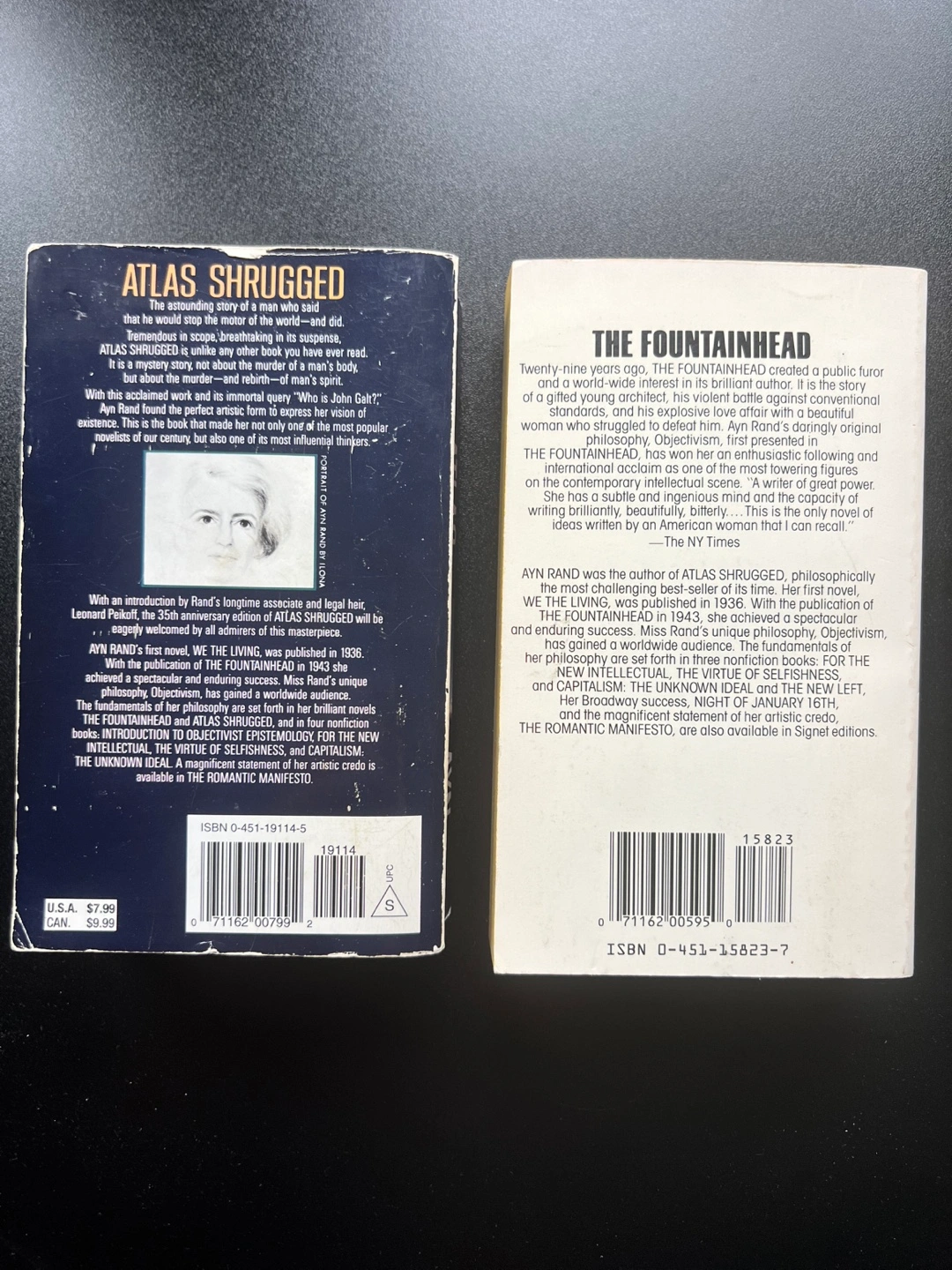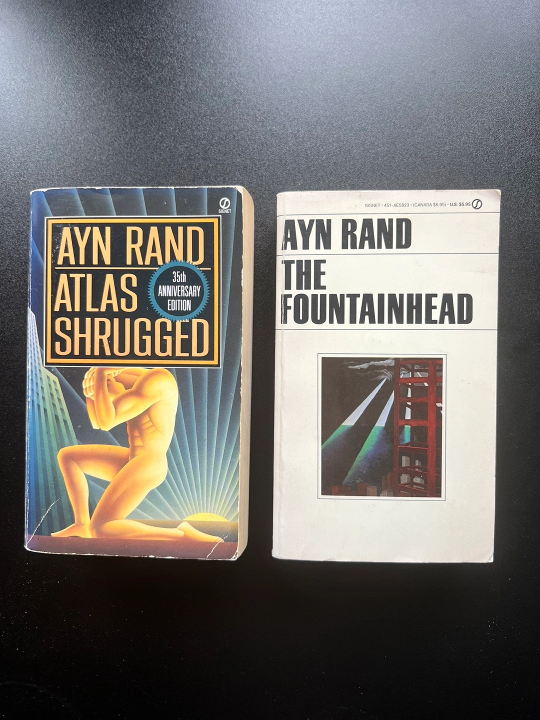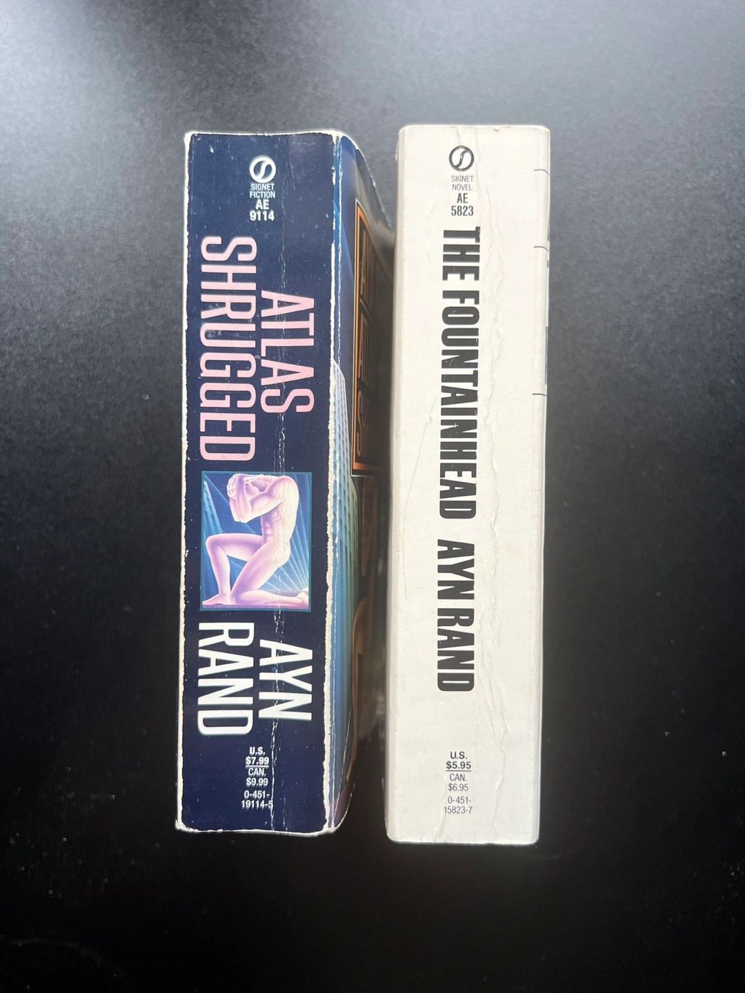 Pair of paperback novels by Ayn Rand. Includes Atlas Shrugged (35th Anniversary Edition) and The Fountainhead. Signet Classics editions. $5 each
