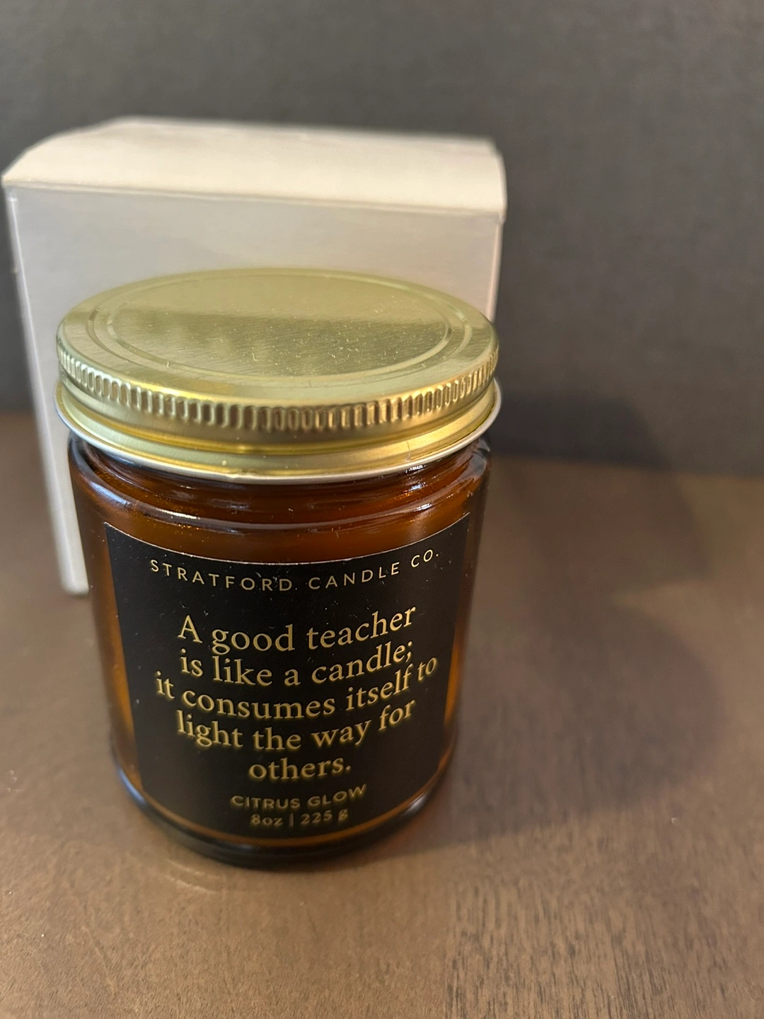 8oz amber glass jar candle. Citrus Glow scent. Gold lid. Inspirational quote on jar. New, unused. Comes with a white gift box.