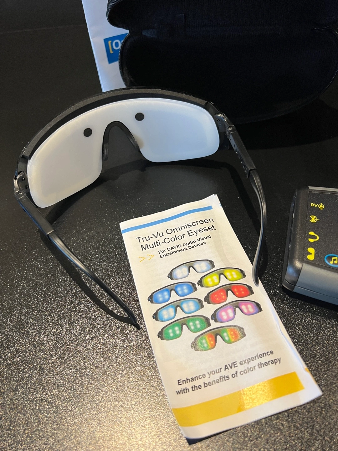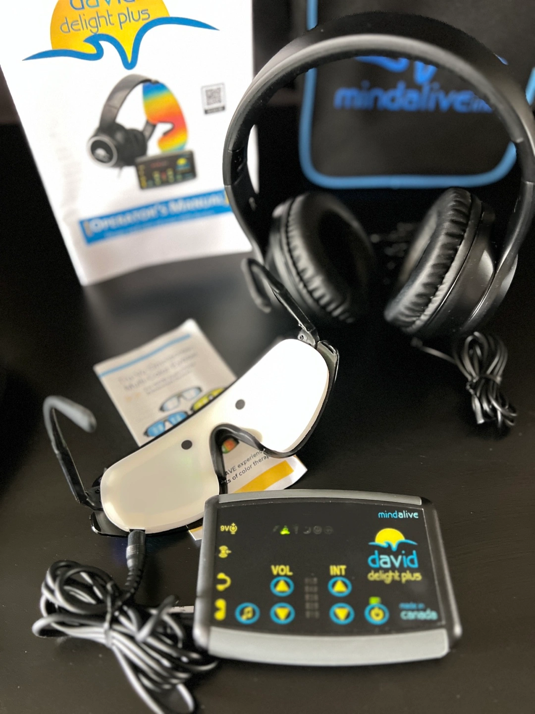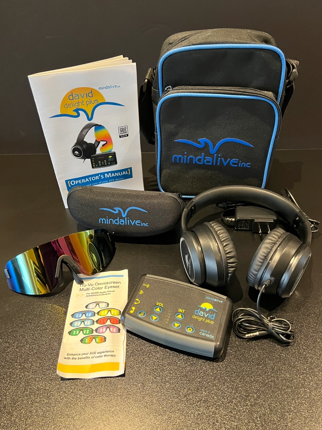 Brand New! Complete MindAlive David Delight Plus Audio-Visual Stimulation device. Includes eyewear, headphones, control unit, carrying case, and manual. Enhance your meditation, hypnosis, relaxation experience with syncronized color & sound therapy - used together or separately. The DAVID Delight Plus is an innovative portable hand-held device that offers a non-pharmaceutical approach to wellness using Audio-Visual Entrainment (AVE) technology. By using flashing lights and pulsing tones, the Delight Plus provides a non-invasive way to achieve peak mental and physical well-being How It Works: The DAVID Delight Plus uses gentle pulses of light and sound to help guide your brain into deeply relaxed, focused, or meditative states — a technique known as audio-visual entrainment (AVE). • Sound therapy (via headphones): You’ll hear rhythmic tones (not music) designed to match and influence your brainwaves — ideal for calming the mind, improving focus, or easing into sleep. • Light therapy (via glasses): Soft, colored lights gently pulse in sync with the audio, further supporting the brainwave shift. This natural, drug-free method can support: • Stress reduction • Improved sleep • Mood balancing • Increased focus & mental clarity Easy to use, deeply relaxing, and backed by years of research. Includes multiple built-in sessions for different goals (relaxation, mood, sleep, focus, etc.). ***Disclaimer: Not recommended for individuals with photosensitive epilepsy or a history of seizures triggered by flashing lights. Please consult a healthcare provider if unsure. Description: Mind Alive DAVID Delight Plus light & sound therapy device (audio-visual entrainment). Helps with stress relief, sleep, mood, focus, and mental clarity using gentle pulses of light and sound. Included: • DAVID Delight Plus unit • Tru-Vu Omniscreen glasses • Headphones • Carrying case • Adapter • Manual + insert • Battery *****PLEASE NOTE: Disclaimer - Not recommended for individuals with photosensitive epilepsy or a history of seizures triggered by flashing lights. Please consult a healthcare provider if unsure. Paid: $595 CAD +tax https://mindalive.com/products/david-delight-plus