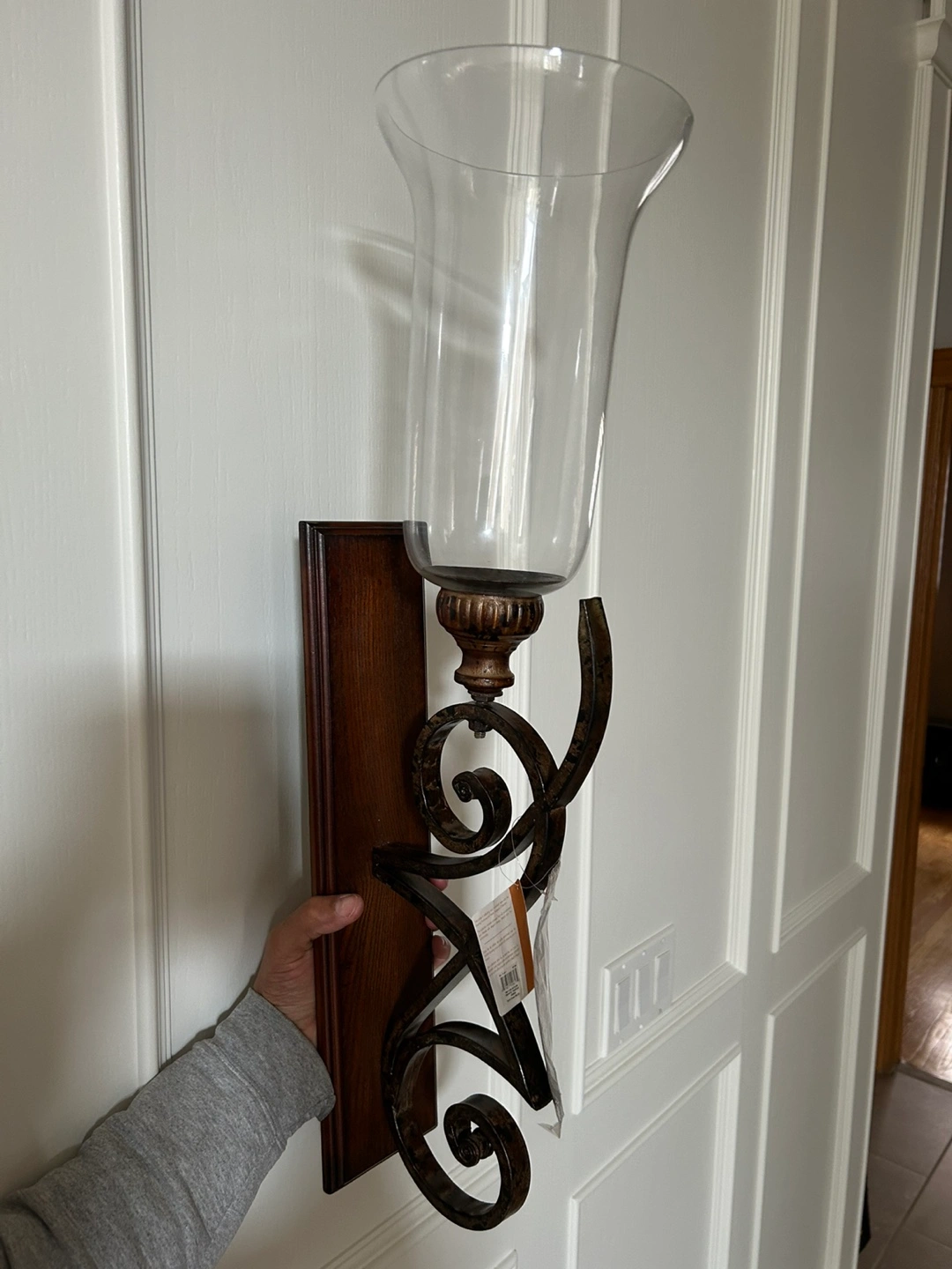 2 Beautiful dark brown metal candle holders. Features scrolling accents and a clear glass hurricane. Wooden backing. New, never used.