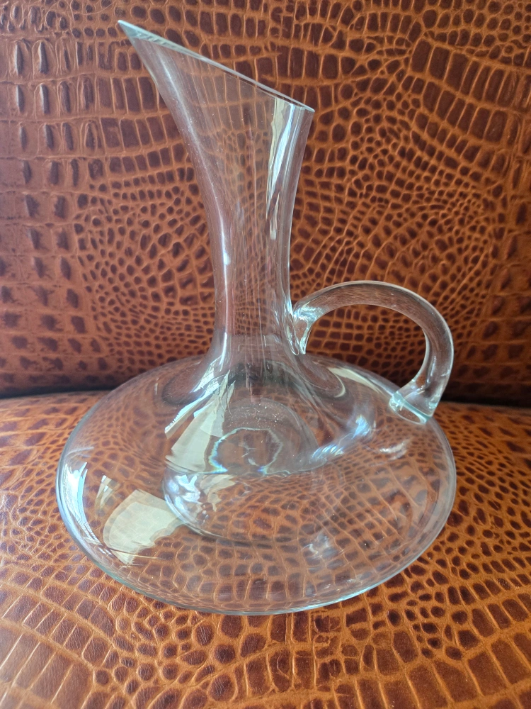 Beautiful clear glass decanter. Wide base and a gracefully curved neck. Features a convenient handle. Perfect for serving wine or other beverages. No box!!!! Pickup only mississauga