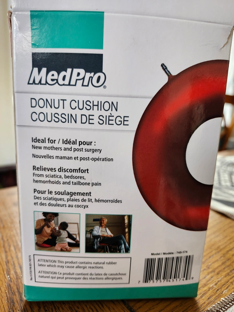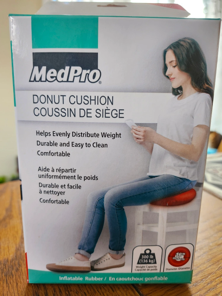 Inflatable rubber donut cushion. Helps evenly distribute weight. Comfortable and easy to clean. 300 lb weight capacity. 16" diameter. Ideal for new mothers and post-surgery. Relieves discomfort from sciatica, bedsores, hemorrhoids and tailbone pain. Used once.