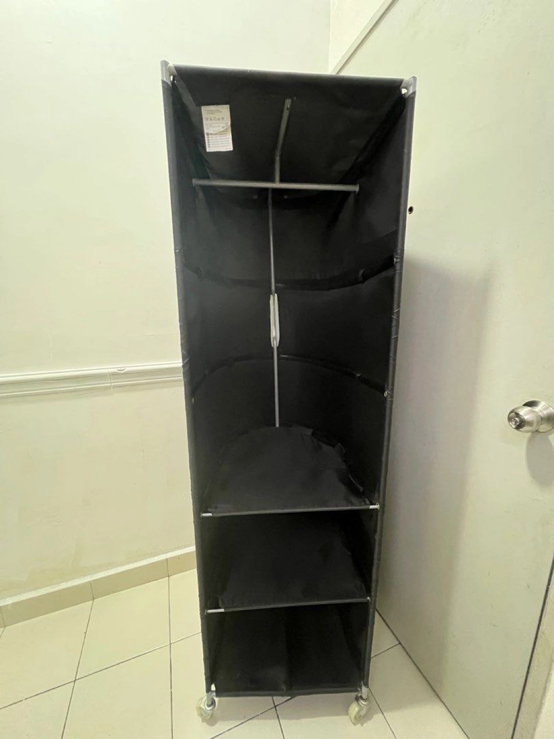 This is a collapsible closet that can be used for storage or to create a temporary closet. It features a hanging rod. Used it for a month to hang my jackets and landlord was kind enuf to install a closet for me to use versus this. Please note this just has the shelf down in the picture. Haven’t used it in a while and need to downsize. This already dismantled and ready to go!