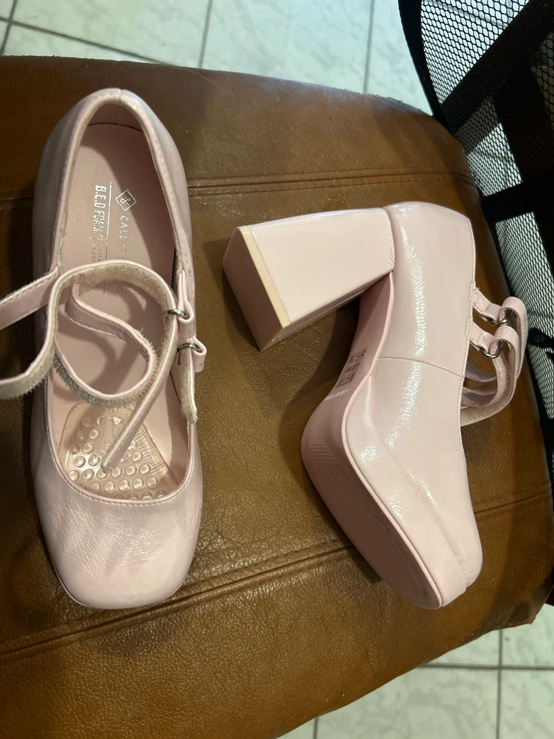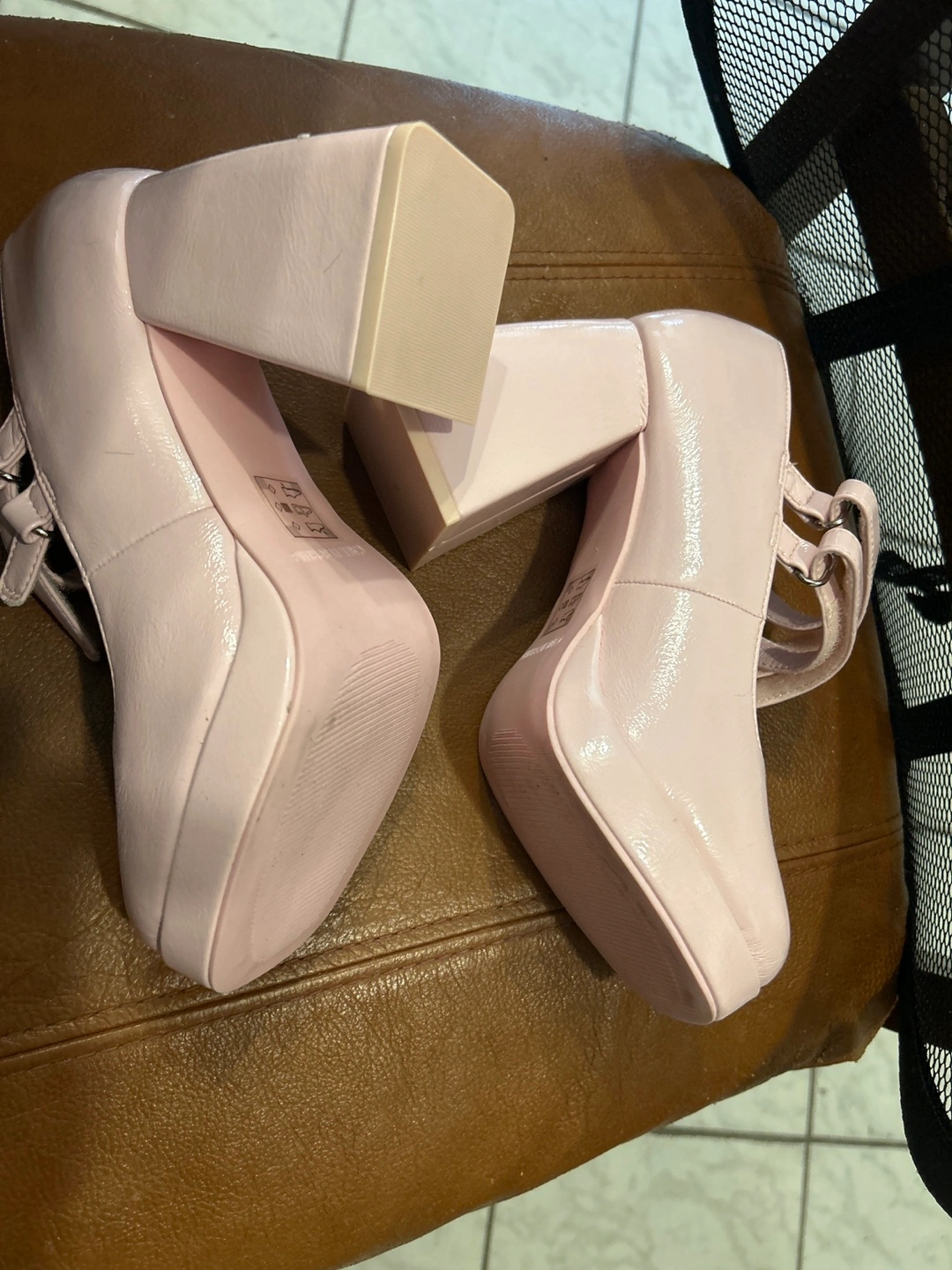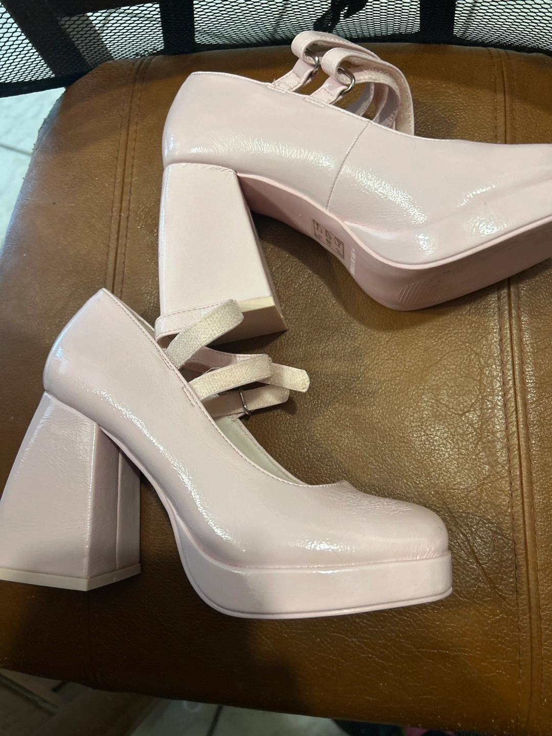 Adorable light pink platform heels. Features chunky heels and Mary Jane straps. Excellent for adding a touch of retro flair to your outfit.