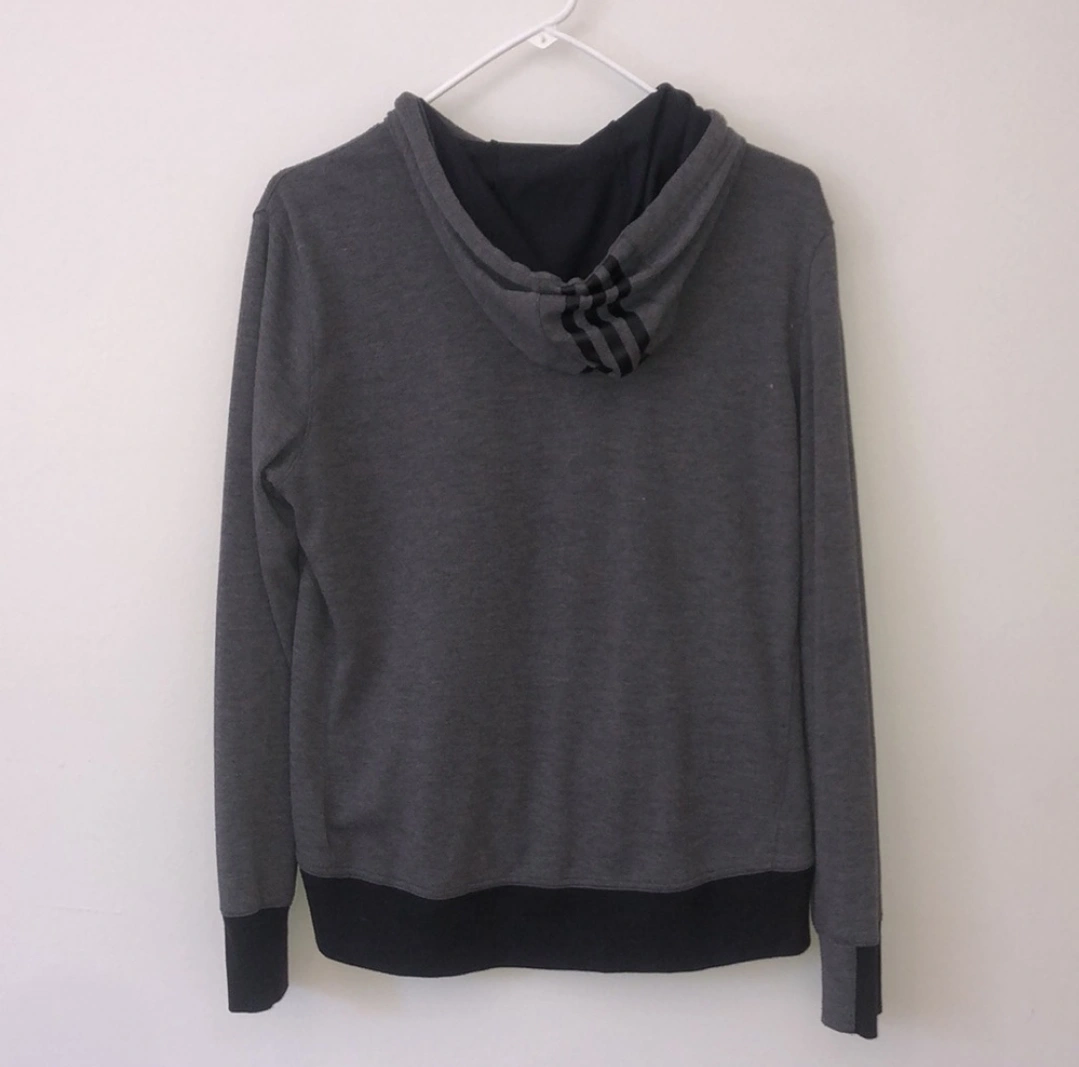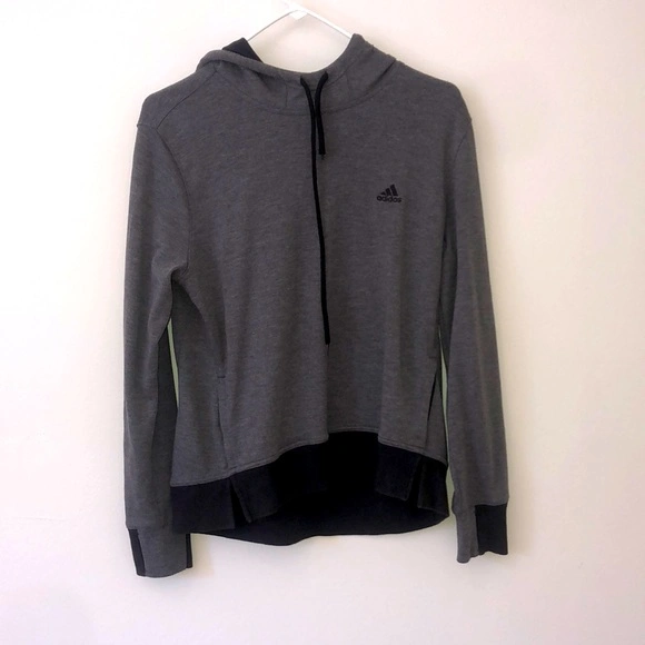 Grey Adidas hoodie. Long sleeves, drawstring hood. Black accents at the hem and cuffs. Great for layering or casual wear. Lightweight NWOT has thumb holes on sleeves