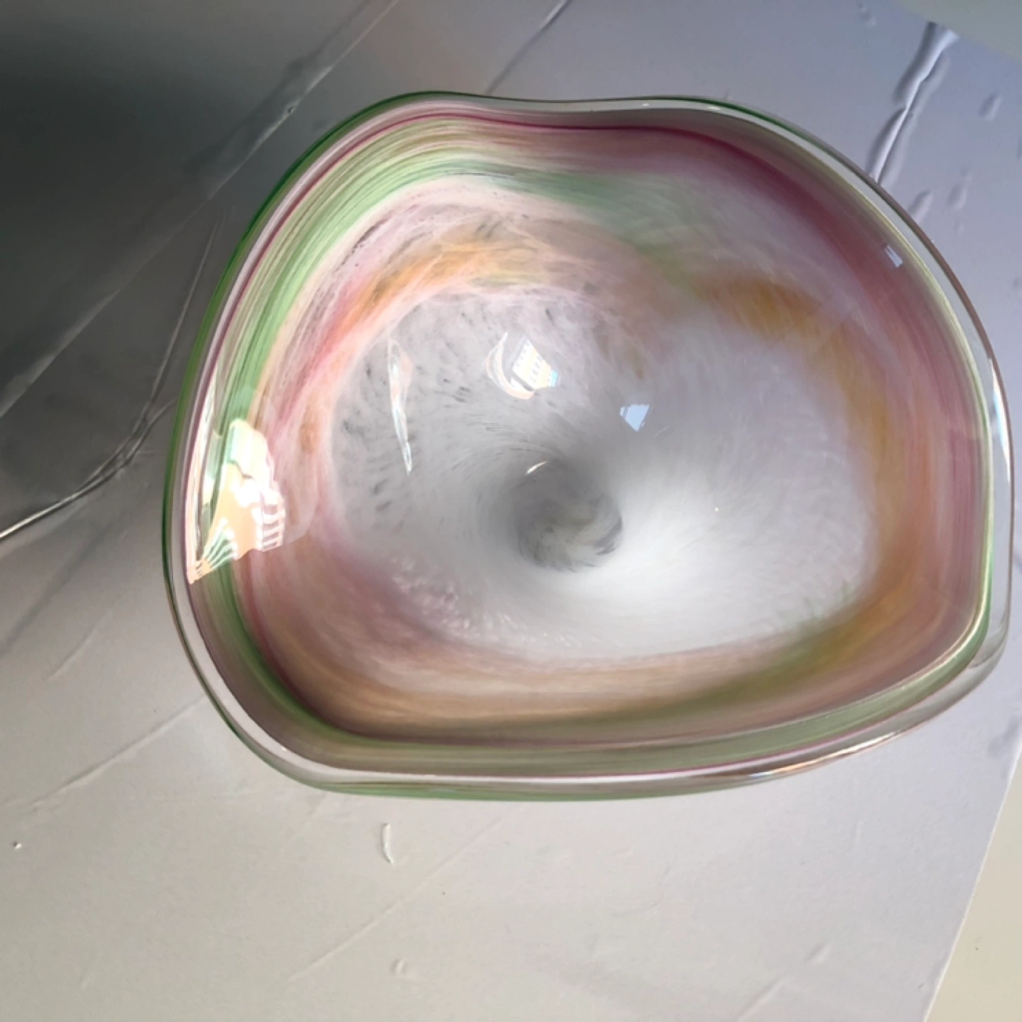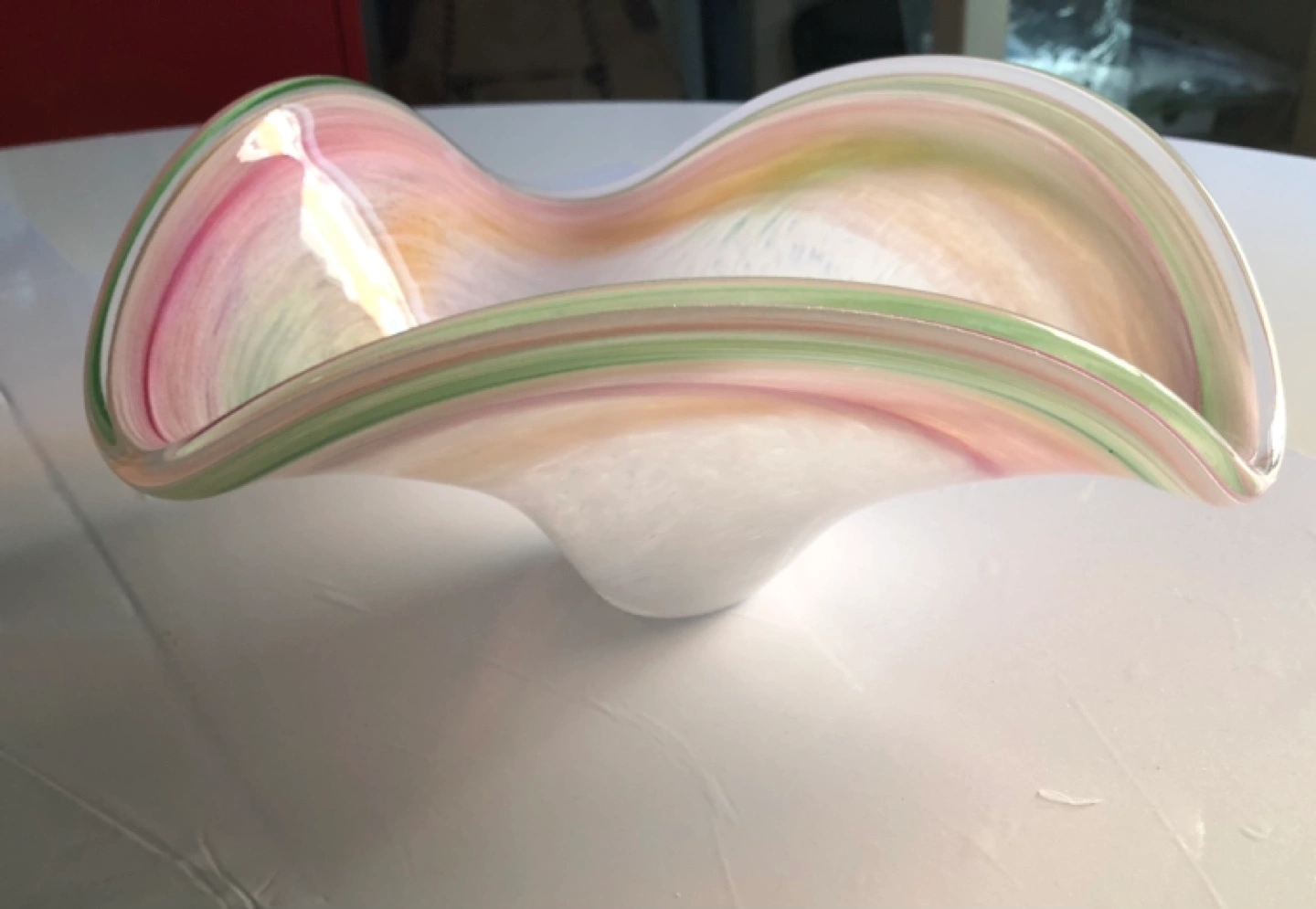 Beautiful glass bowl by Murano Glass. Hand made in Italy. Features a unique, swirled design in pastel colours. Elegant and decorative. Perfect for fruit, candy, or as a standalone art piece.