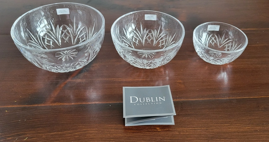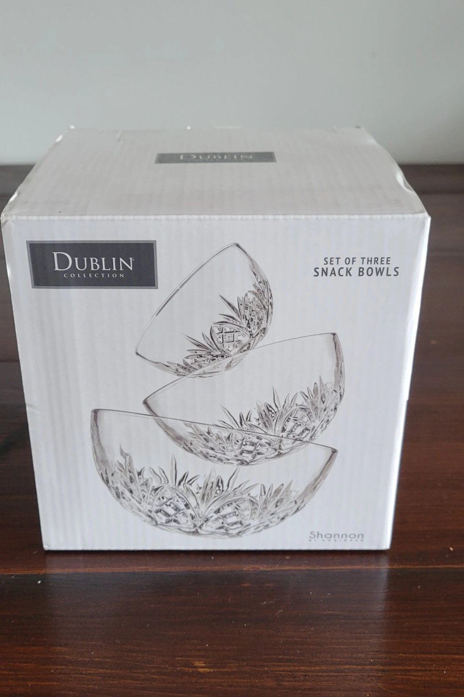 Set of three crystal Dublin Collection snack bowls. Elegant design. New in box. Great for gifting! Sells for $93.33 +tax on Walmart. Own it for a much lesser price! Check out my other listings and bundle to save. ππ»πΈ Cash and pickup only on Brimley and Eglinton Rd E. in Scarborough.