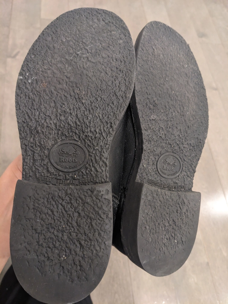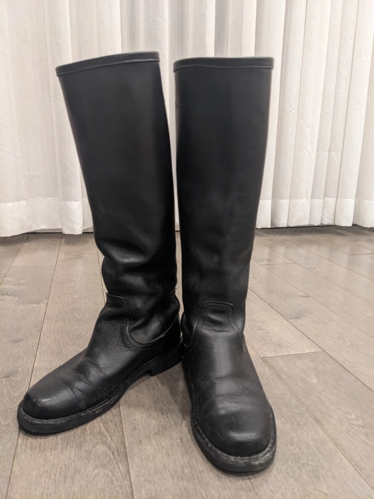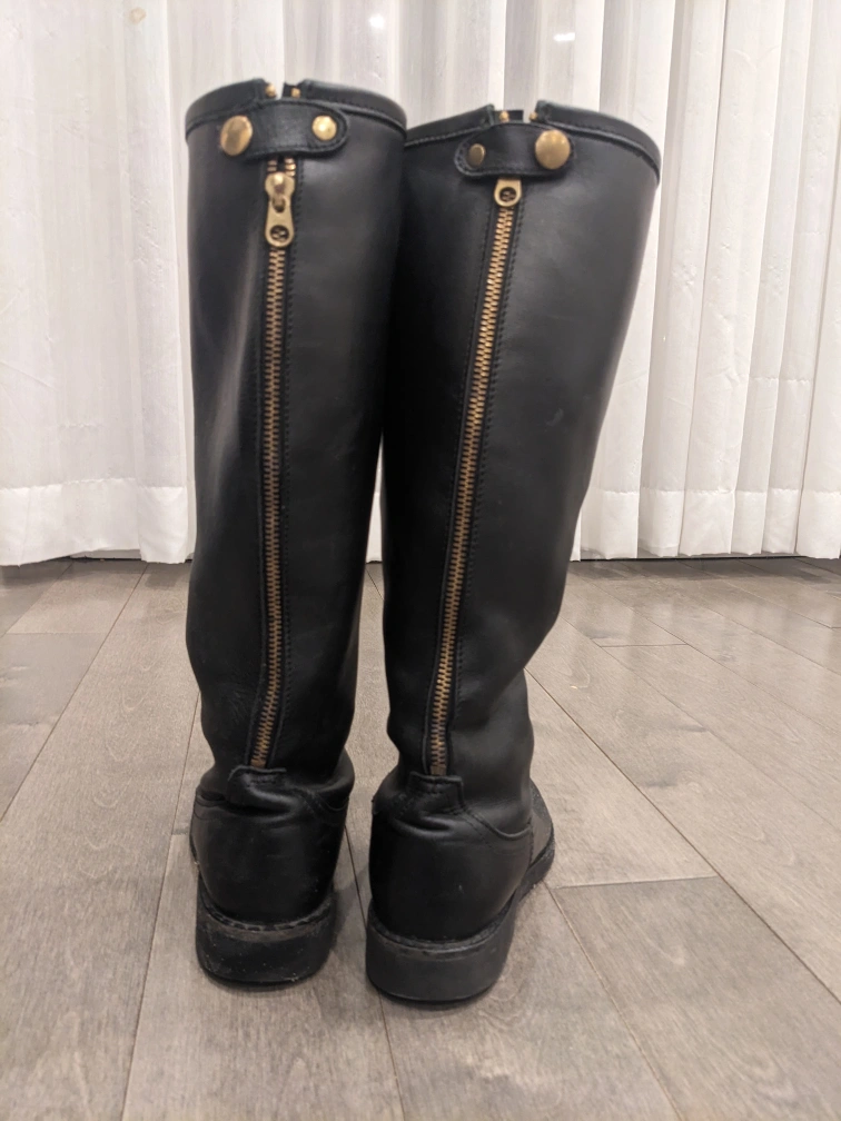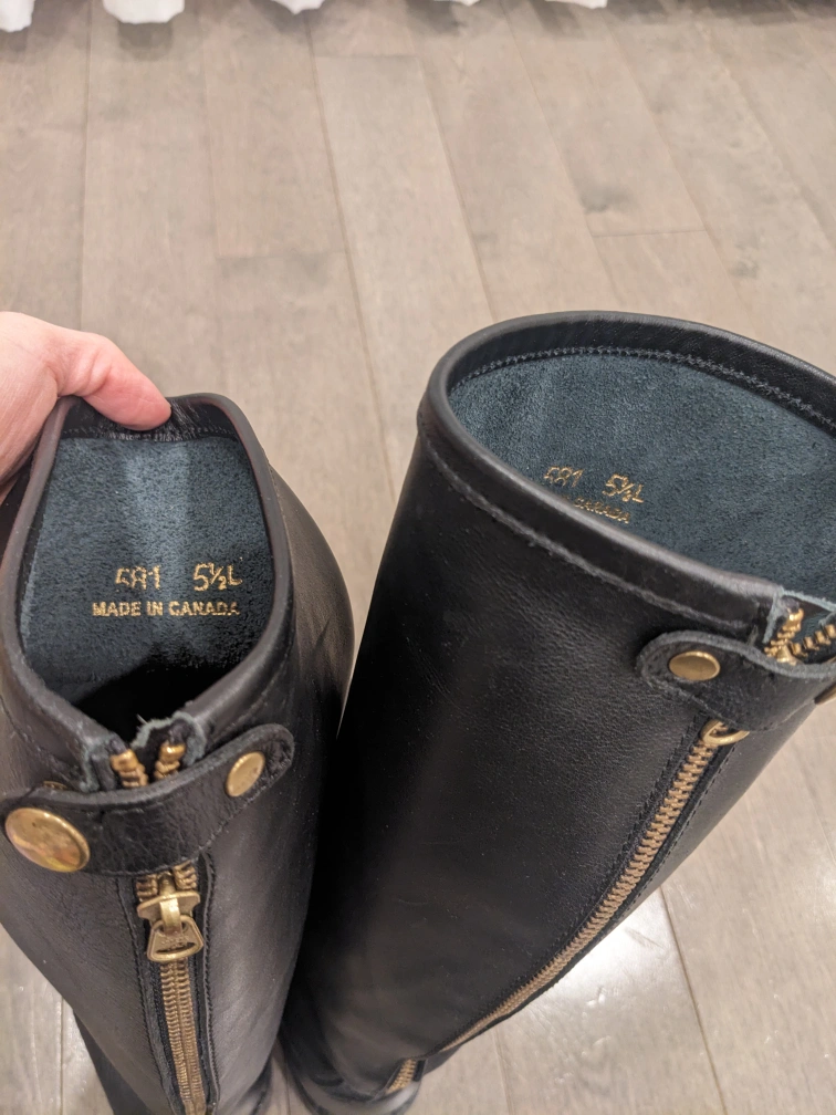 Women's black leather riding boots. Side zippers. Made in Canada. Natural rubber soles. Size 5 1/2.