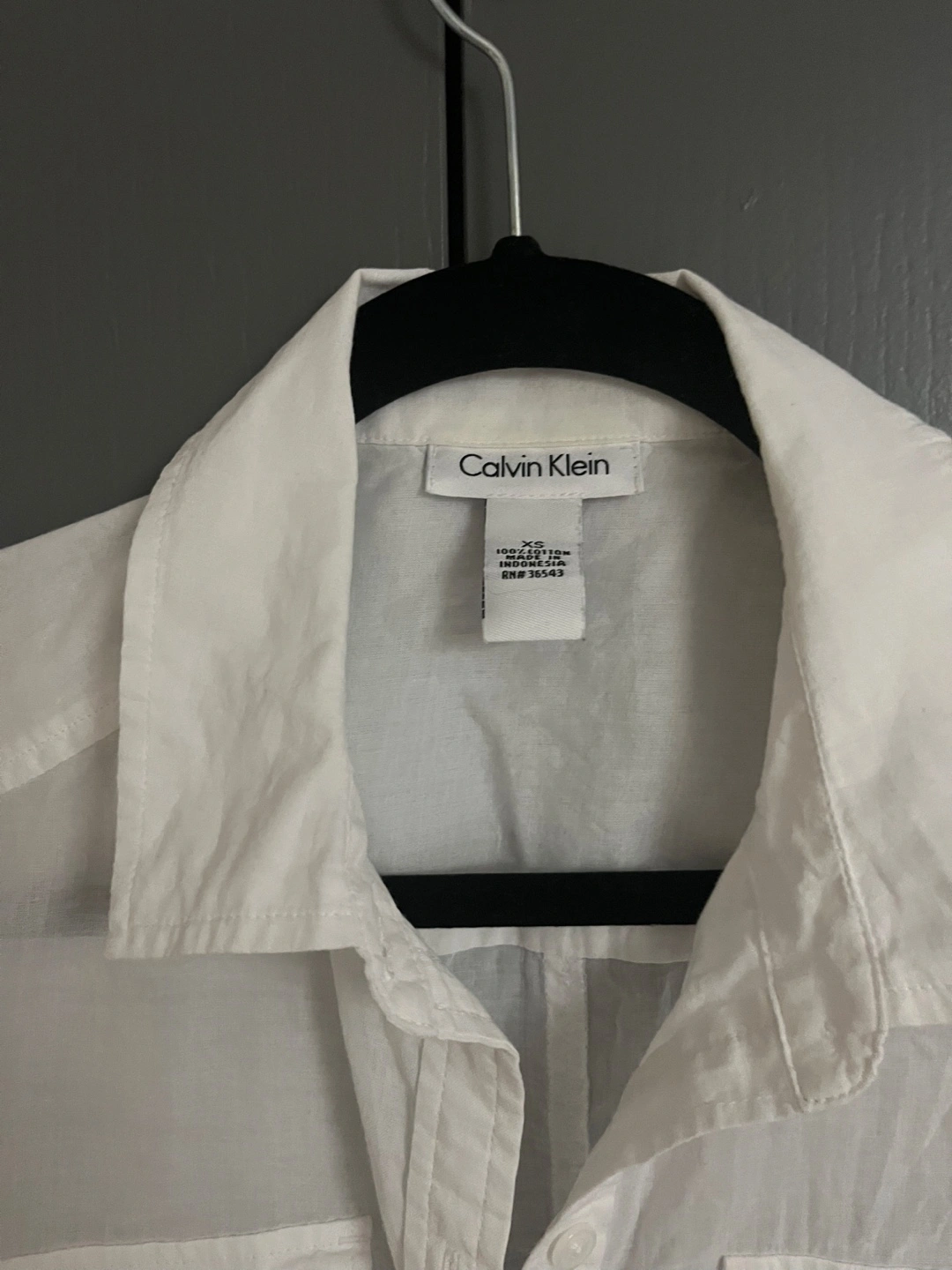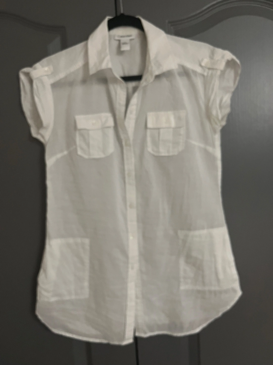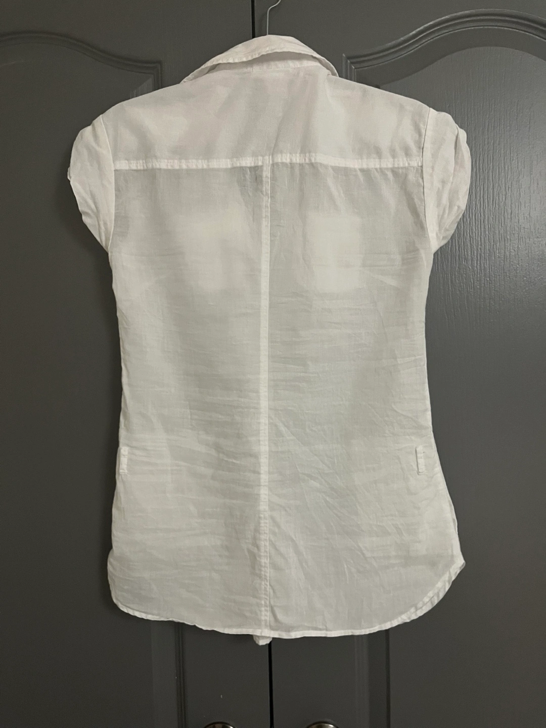 Women's white button-down shirt. Short sleeves. Multiple pockets. 100% cotton. Size XS.
