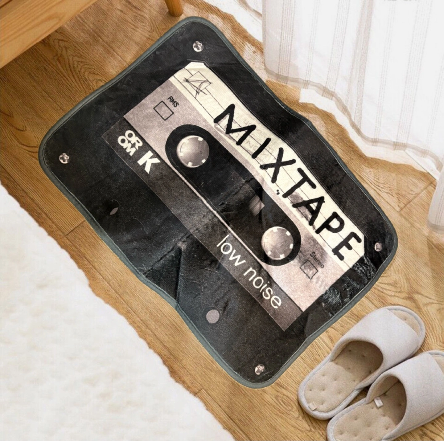 Black and white cassette tape design. Soft, machine washable. Measures approximately 20" x 14". Great for bedrooms or bathrooms.