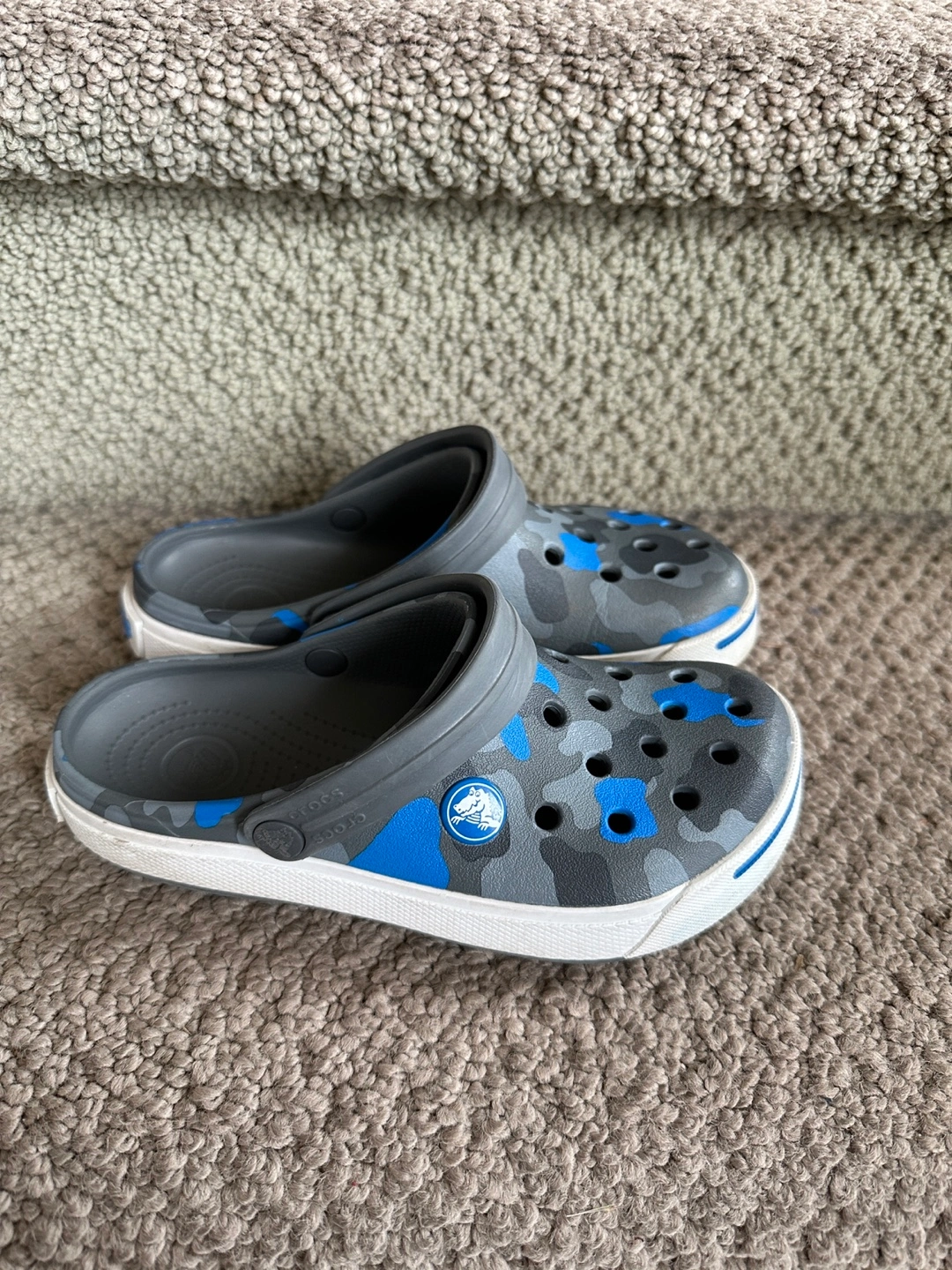 Kids' Crocs clogs. Grey and blue camouflage print. Size C12/C13. Pre-owned.