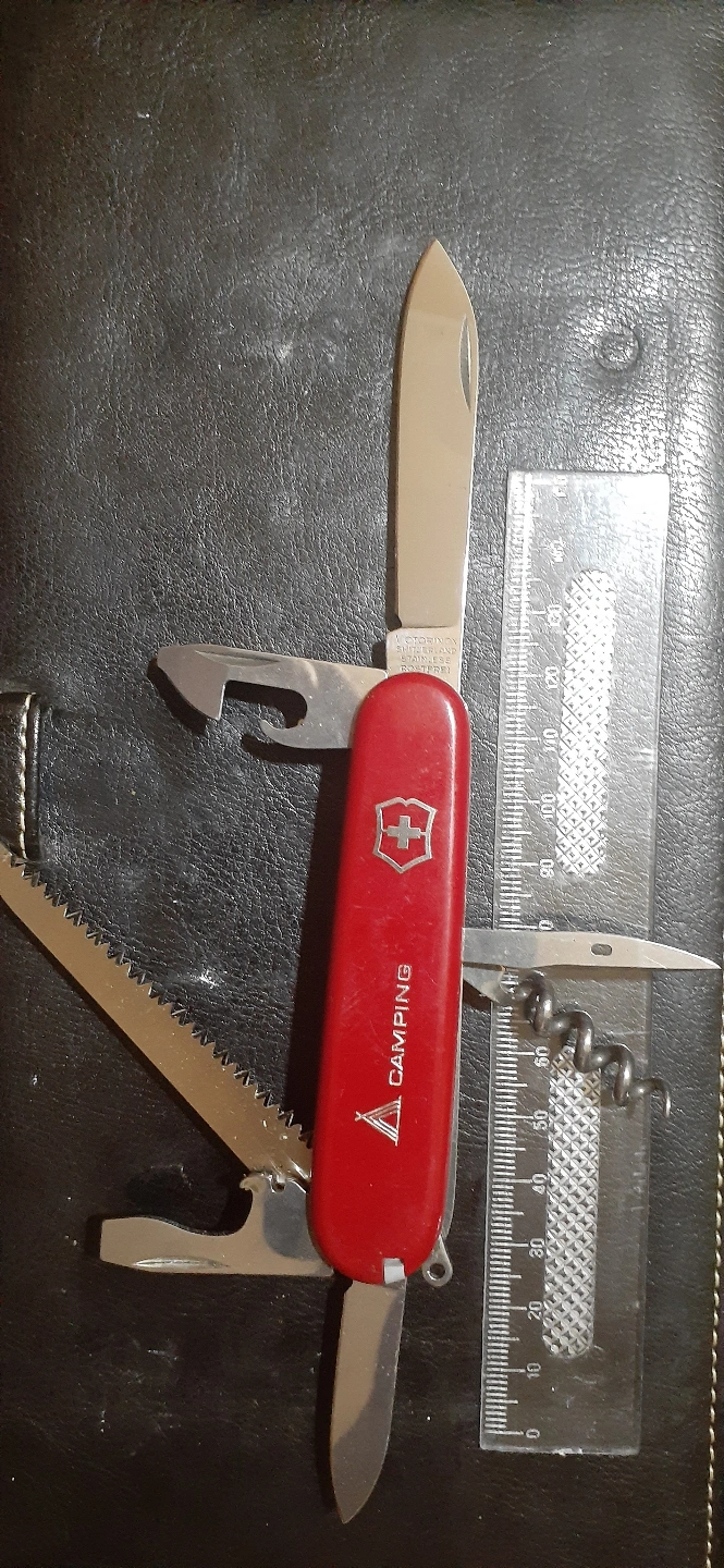 Classic red Swiss Army knife. Features multiple tools including a blade, saw, corkscrew, bottle opener, and more. Excellent condition. final price reduction. open to trades or offers