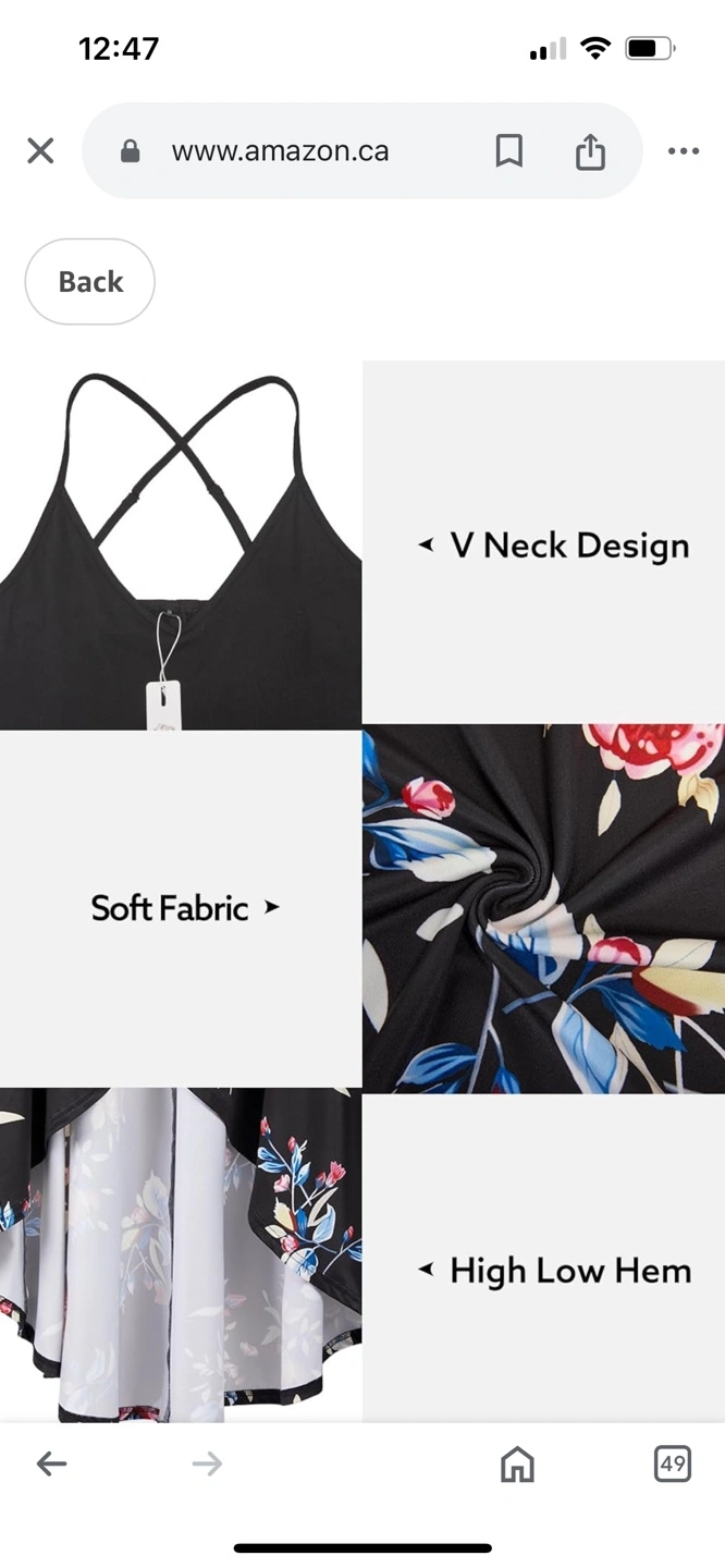 Beautiful black and floral sundress. Features a V-neck, spaghetti straps, and high-low hem. Soft fabric, comfortable fit. Made in China. Size small.