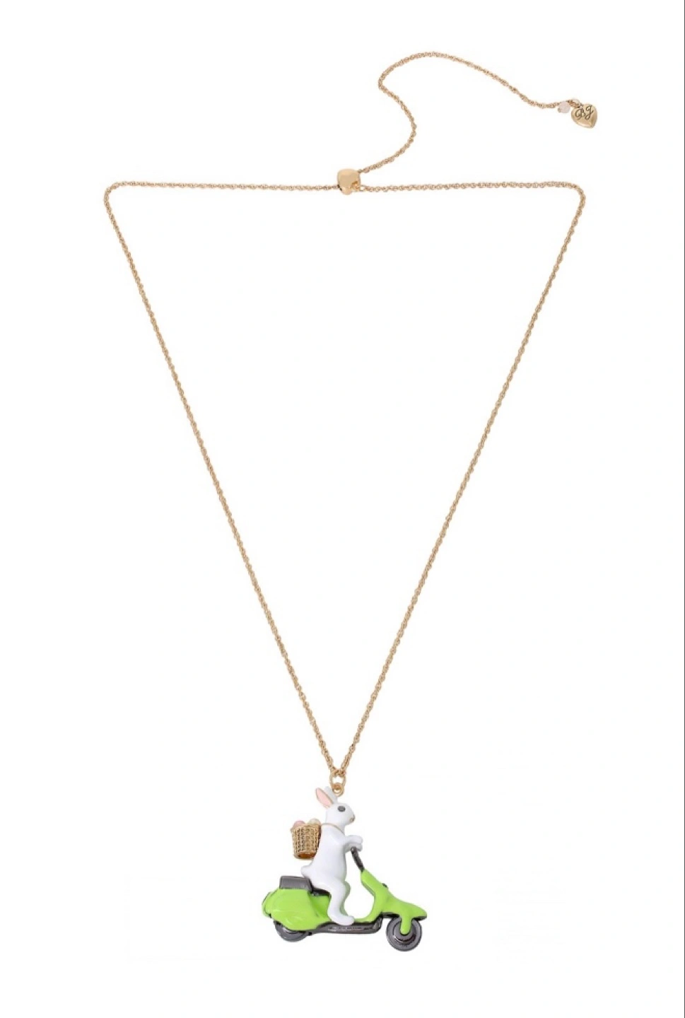 Adorable necklace. Features a white bunny riding a lime green scooter. Gold chain. Comes in original box.