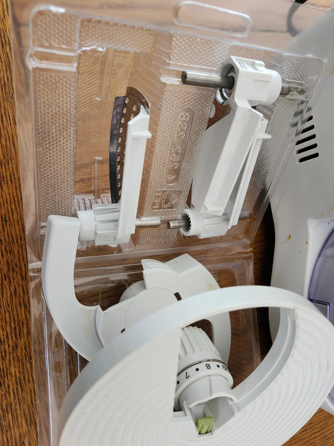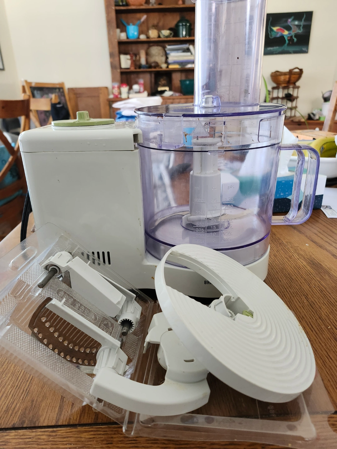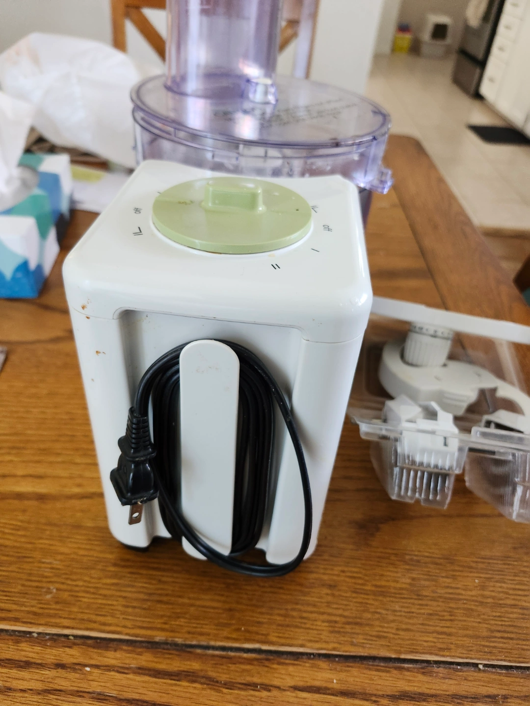 Compact food processor. Includes multiple attachments. Still works well. Moving.