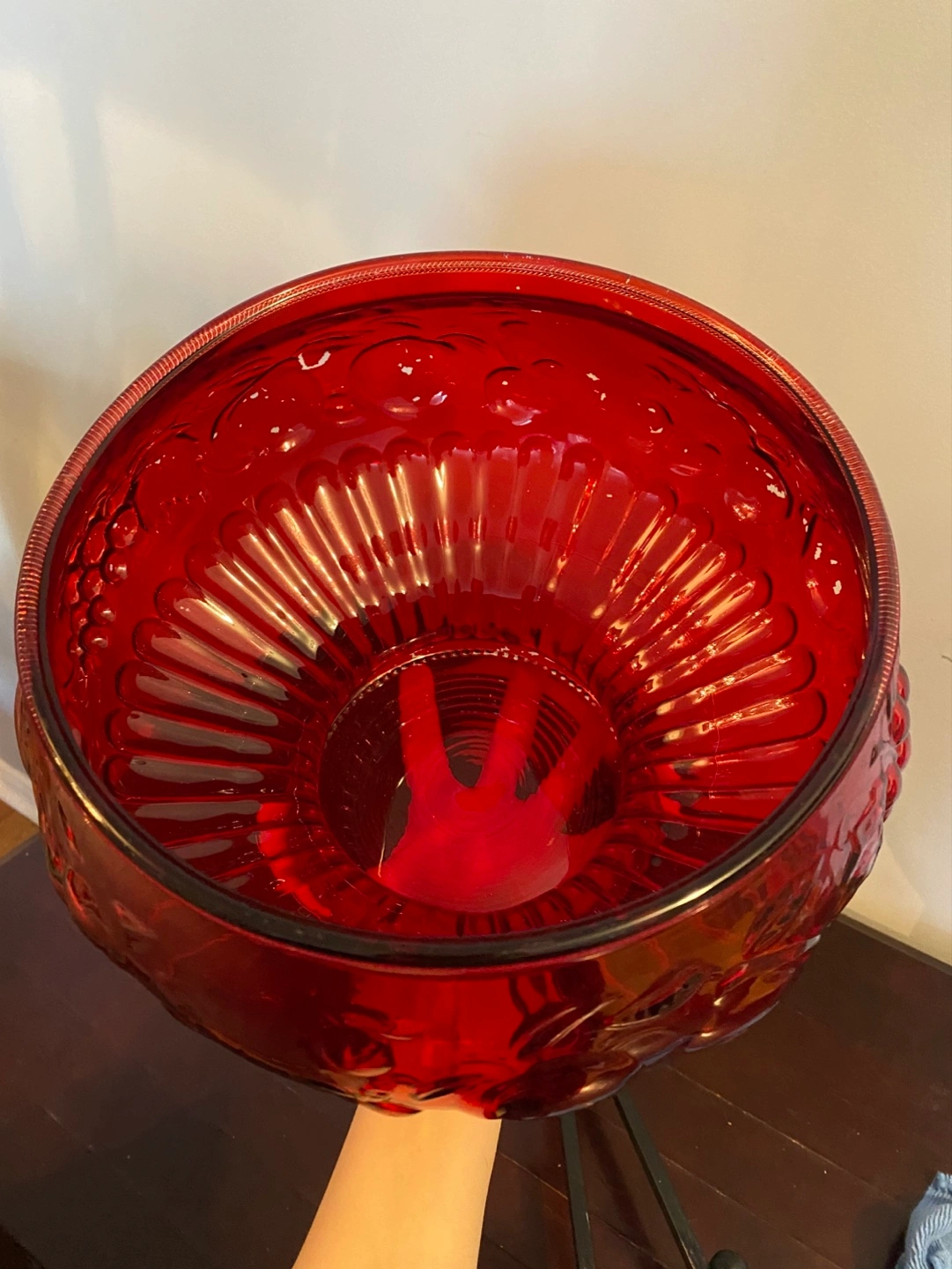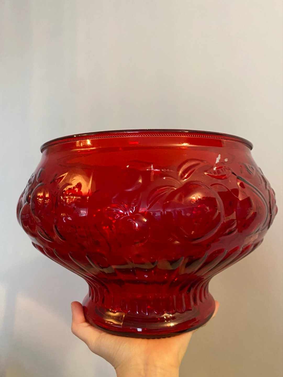 Large red glass bowl. Features embossed fruit design. Pedestal base. Great for fruit, candy, or decorative purposes.